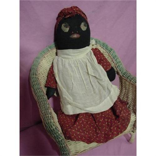 Vintage 1920-30's Stockinette Black Mammy, All Original. Sweet black mammy with googlie painted eyes, measuring about 14" tall. She wears her original calico dress and white cotton apron. She comes from the family of the first black bandleader. She is in good condition but one arm has been repaired. A very nice addition to a black memorabilia collection.