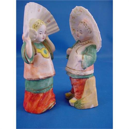 1900's Gebruder Heubach Chinese Twins, Excellent. Pair of twin boy and girl dressed up in chinese costumes of orange, and green colors. They have handpainted eyes and rosy cheeks. They are in excellent condition with no hairlines, damages, or repairs.nt. 5in and 5 1/2in tall. This very cute pair are marked with Heubach's incised Sunburst mark in the back. They are hard to find together and in excellent condition with no hairlines, damages, or repairs. They are dressed in chinese costumes in green, tangerine, and yellow tones with gold trim. A rare set to add to your collection!