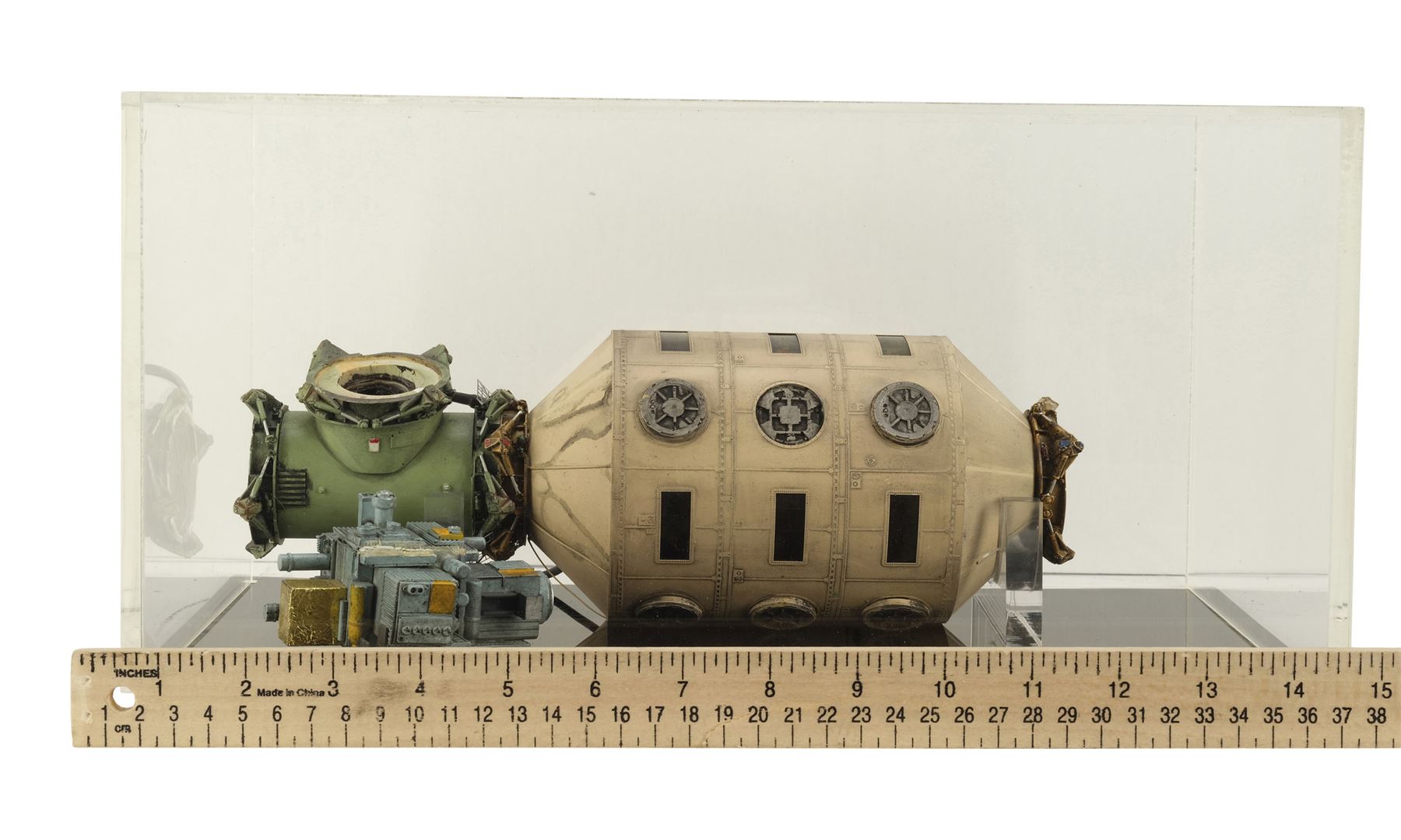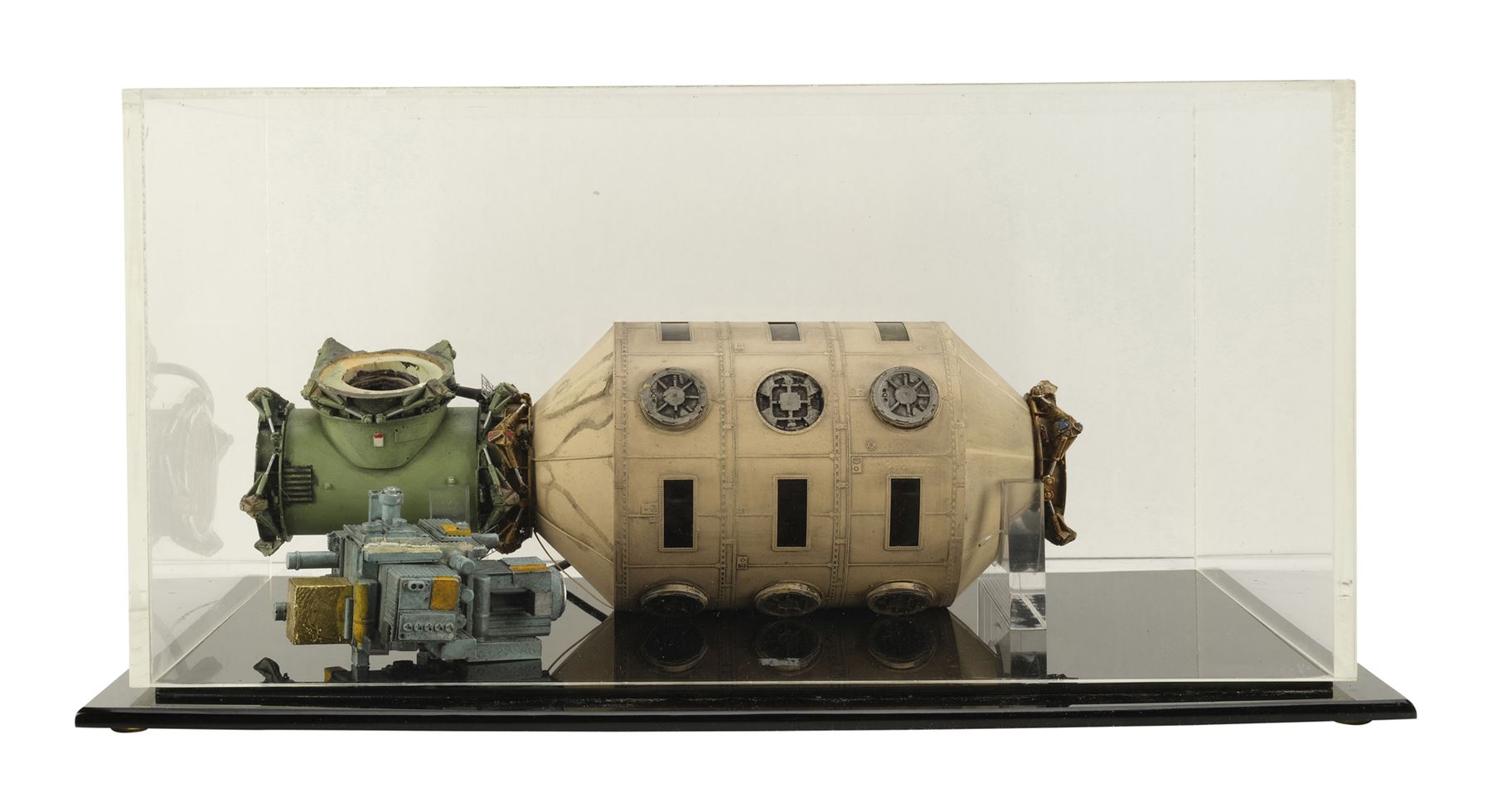 This lot consists of a beige and gray painted textured plastic miniature featuring a green painted resin connection tunnel, black film-covered windows, and a gray painted and gold-color foil-wrapped resin engine piece. The model miniature lights up through a protruding cable from the station that connects to a cable wall adapter. Included with this model miniature is a black base and clear acrylic display case. This lot exhibits chipping paint throughout. Dimensions: (largest) 14.5" x 8.5" x 7.25" (37 cm x 21.75 cm x 18.5 cm)