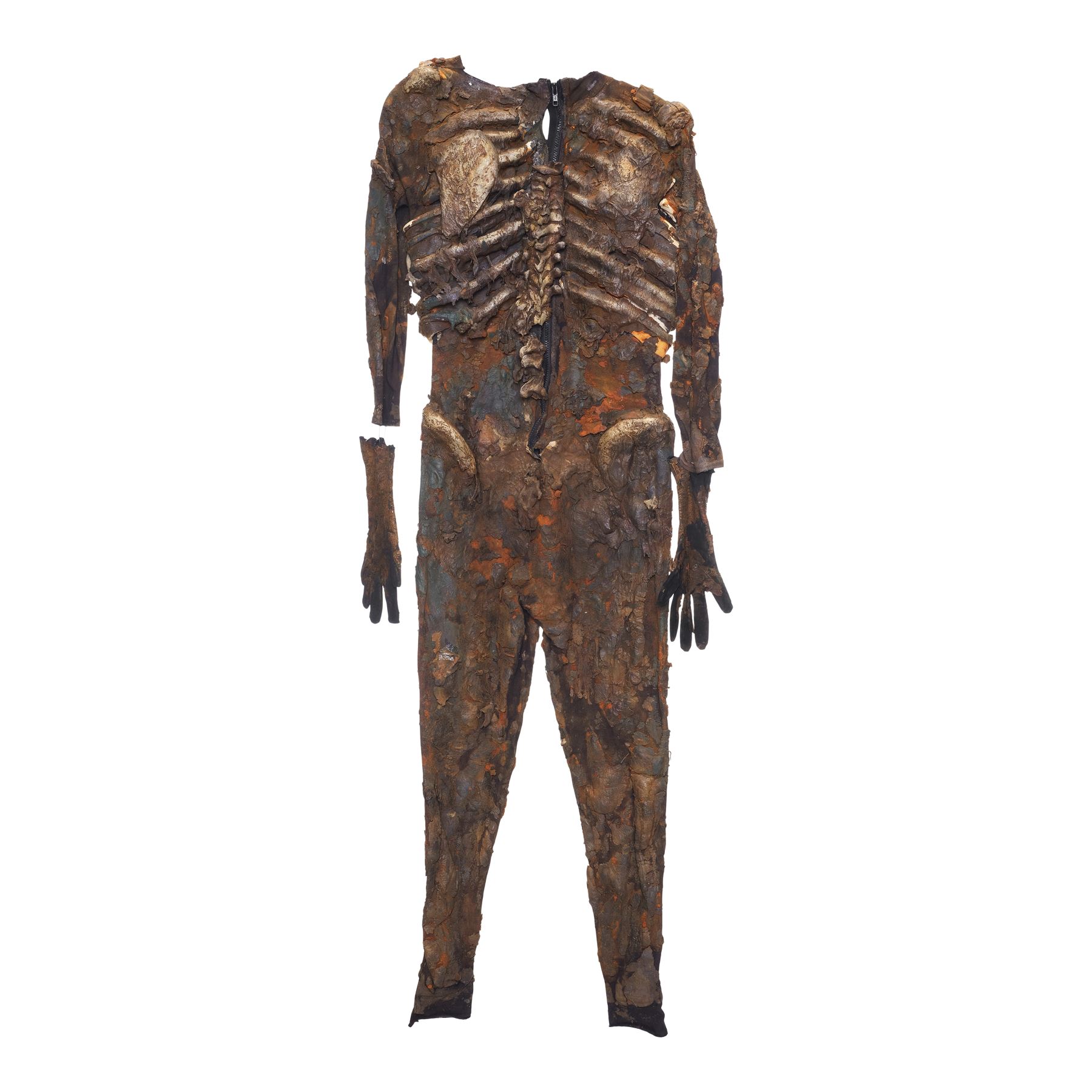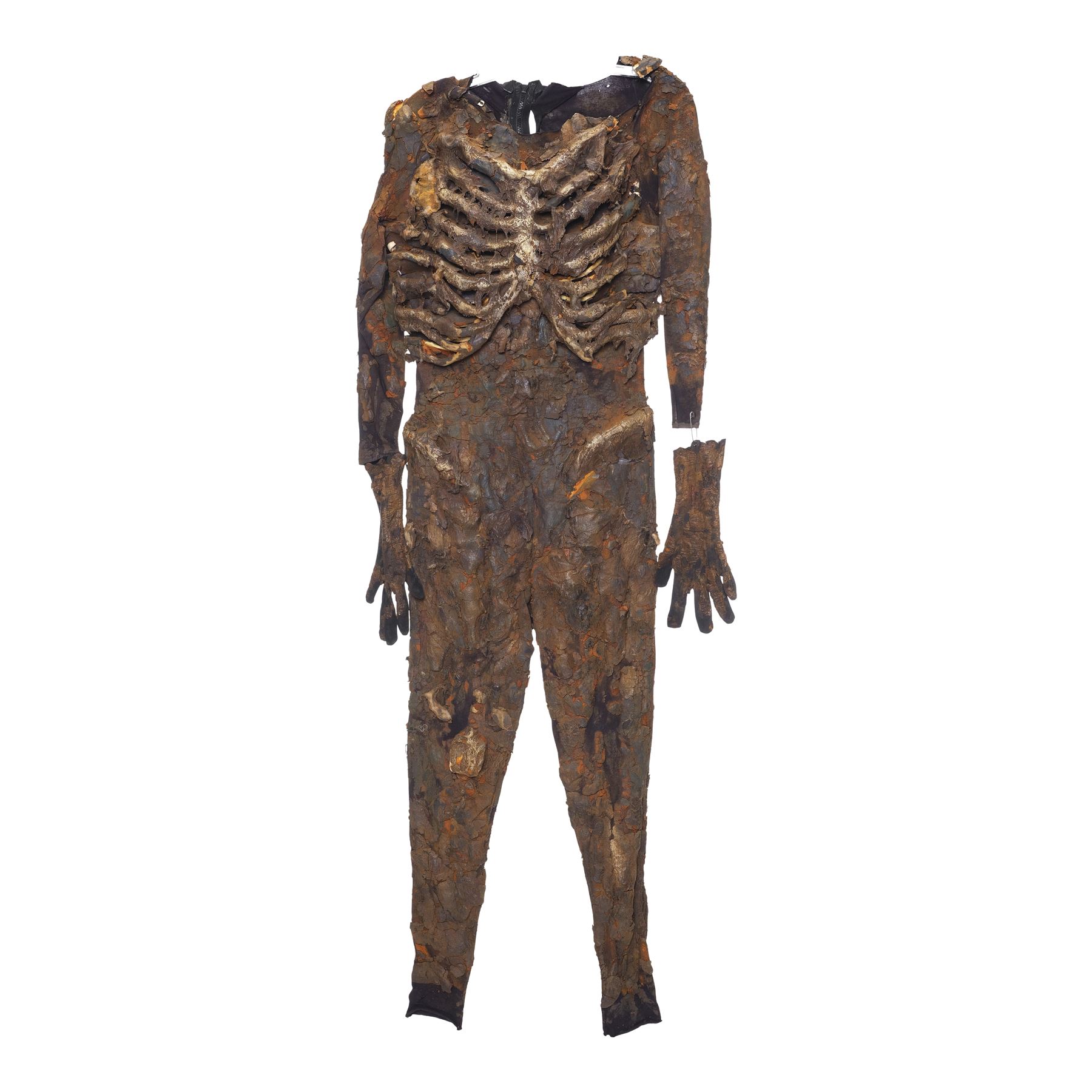 This costume is composed of a black nylon-blend bodysuit with back zip closure and matching gloves. The suit and gloves feature a foam latex covering painted in various shades of gray and brown, crafted to resemble a desiccated corpse with visible rib cage and hip bones. This costume exhibits cracked and crumbling foam and caution should be used when handling.