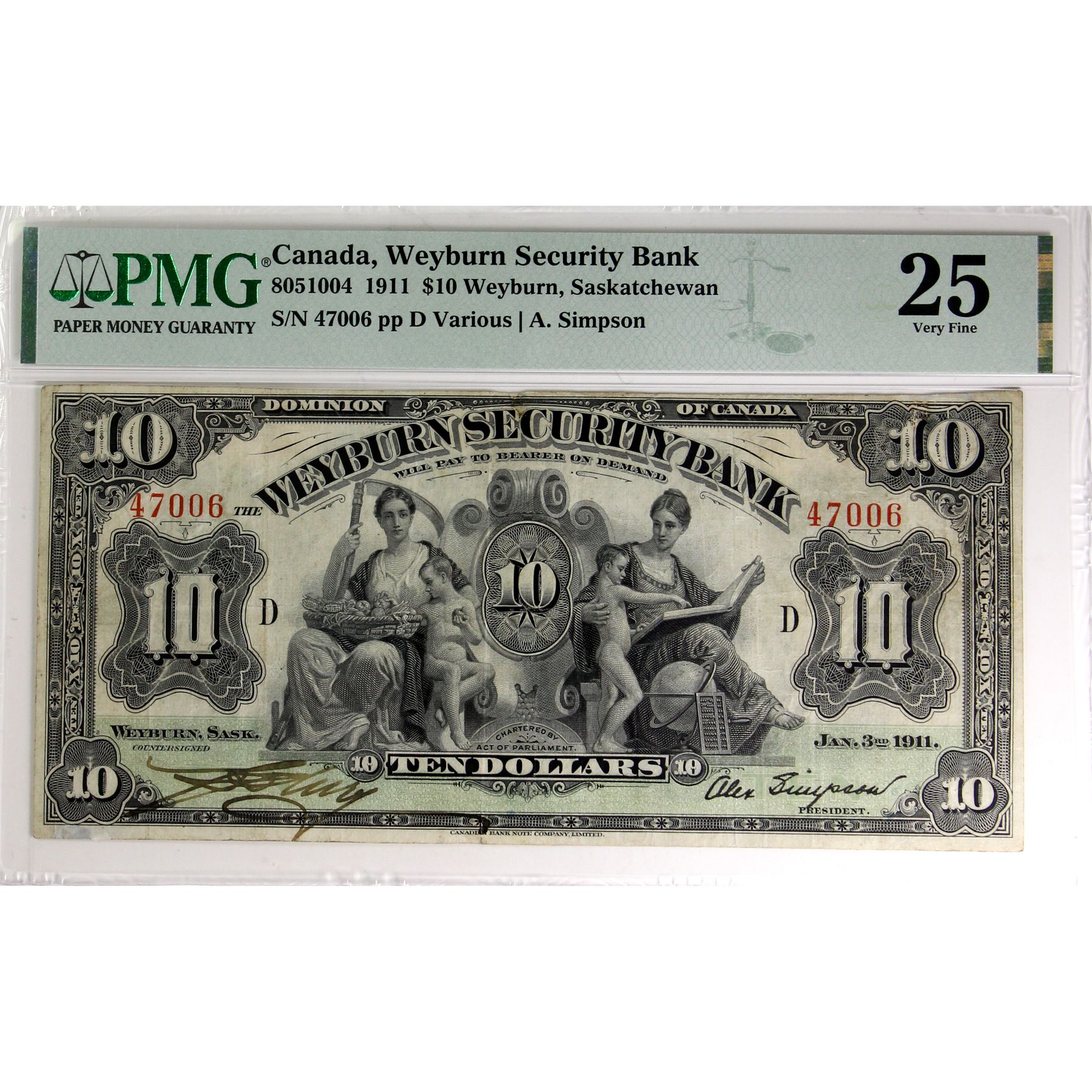 At the turn of the century, gleaming rails snaked into Weyburn District, Saskatchewan, bringing settlers and speculators. American investors founded the Weyburn Security Company, then Bank, to deal in land and money. Chartered by 1910, the Bank proceeded to issue three denominations of its own notes. The Bank had influence enough to secure the Weyburn Amendment to Canada’s Bank Act, allowing it to sell insurance for hail damage from prairie tempests. But a new storm broke over the Bank soon enough, as the Depression racked the prairies. In 1931 the sun set on this last bank of western Canada, as it was acquired by the Canadian Imperial Bank, now CIBC. Only 15 $10 notes, and 40 other issues, are known to survive.