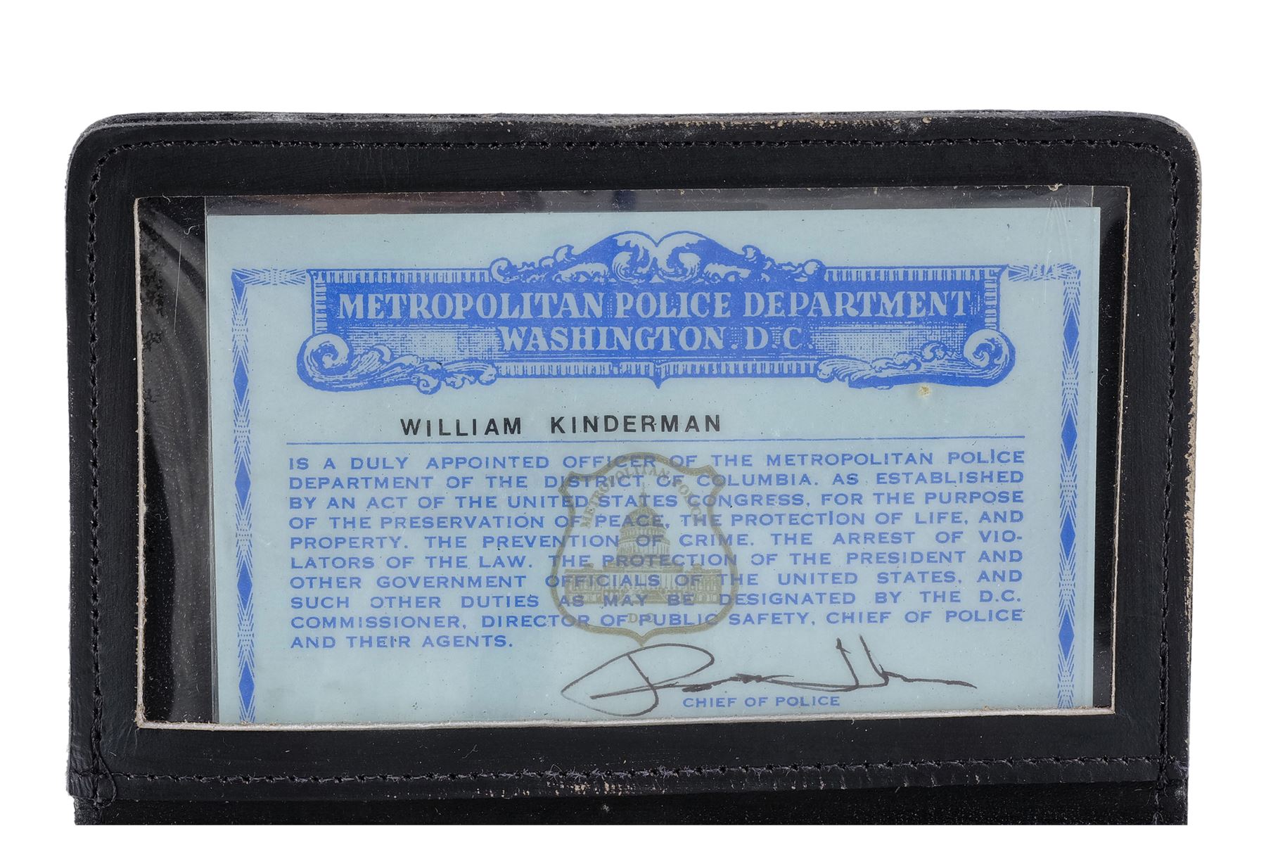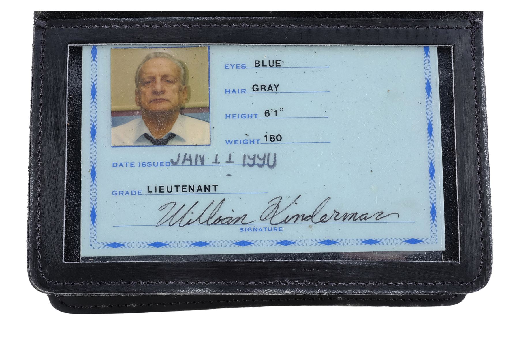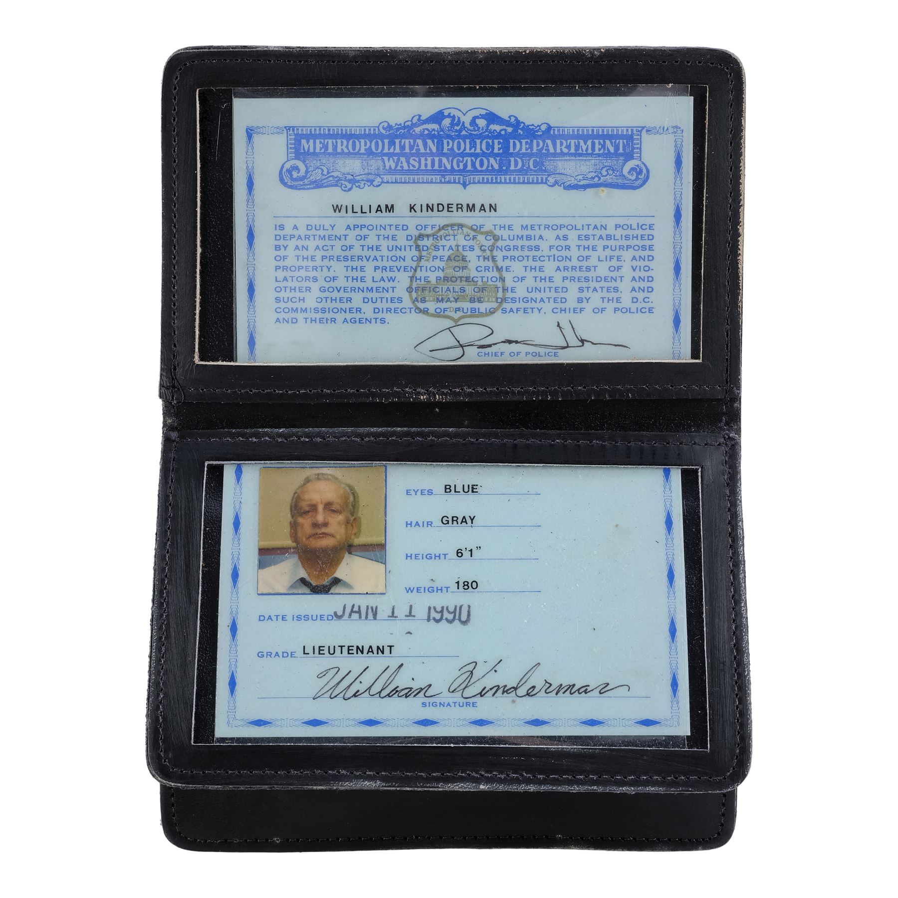 This black leather billfold is labeled "Metropolitan Police" in gold-color print on the front and inset with a Metropolitan Police badge engraved "65" on the interior. It contains printed two pages of a "Metropolitan Police Department" ID, one labeled "WILLIAM KINDERMAN" and one featuring Kinderman's signature, picture, biographical details, and the stamped date "Jan 11 1990." The leather exhibits bending and some separation along its outer seems from production use and age. Dimensions: 3.25" x 5.75" x 0.75" (8.25 cm x 14.25 cm x 1.75 cm)