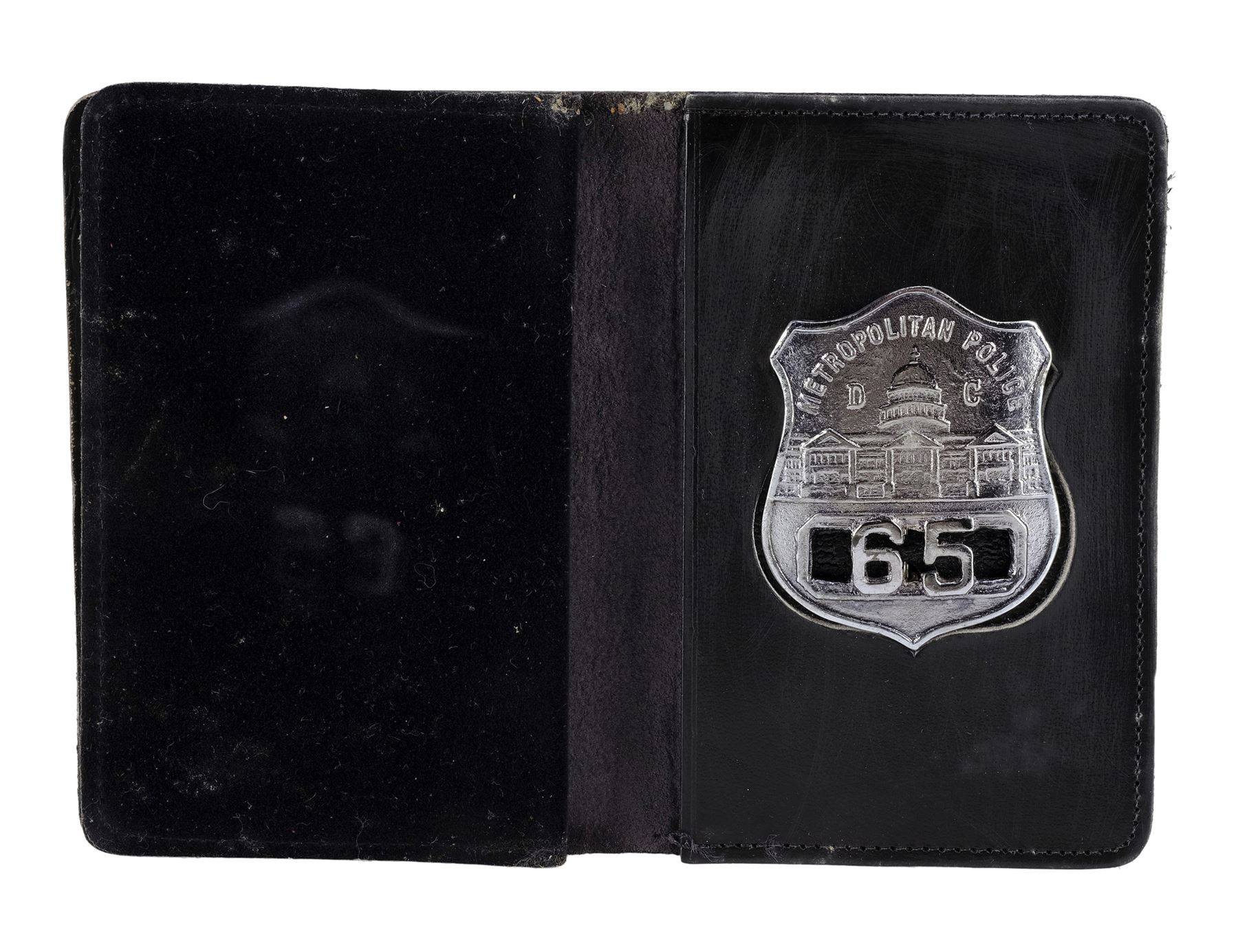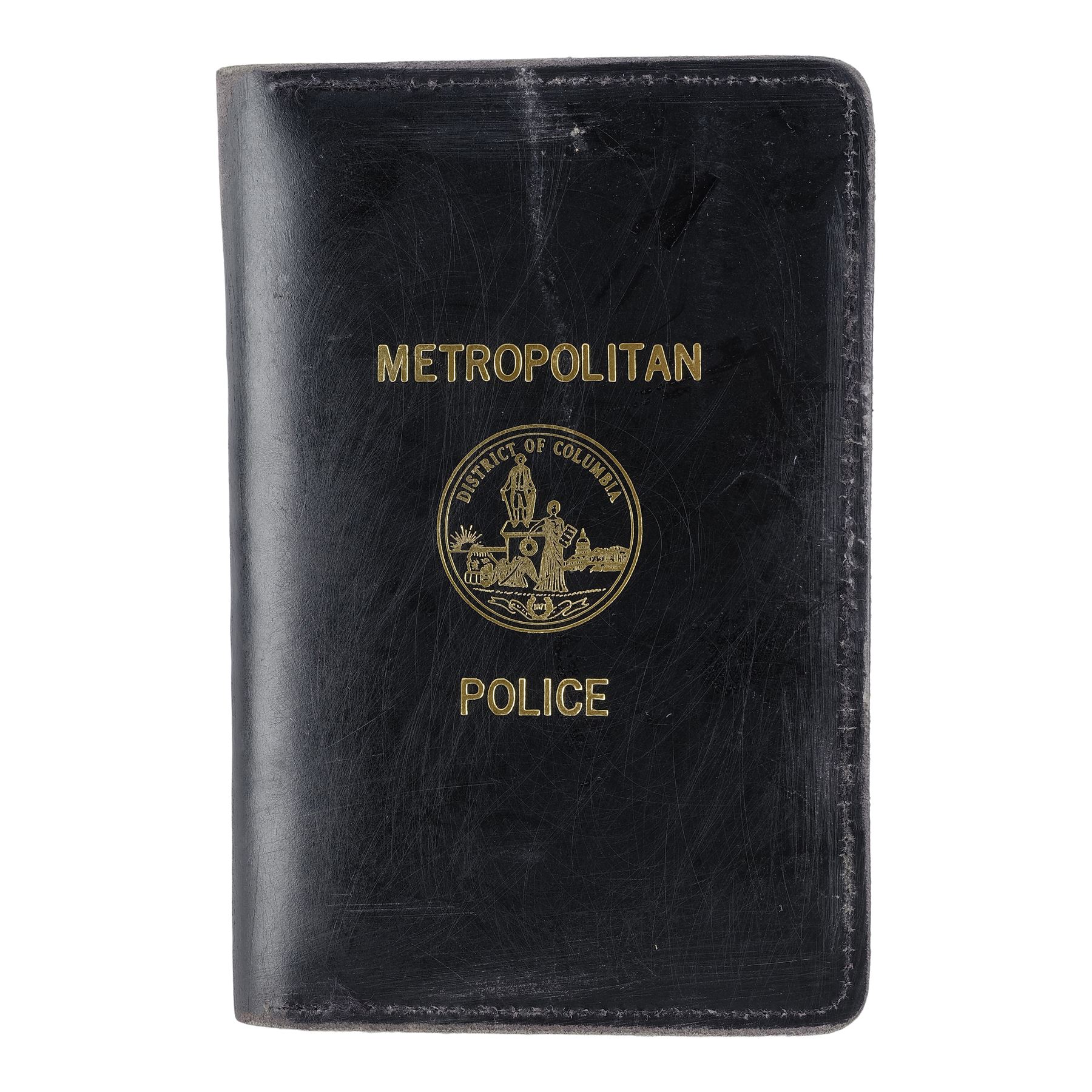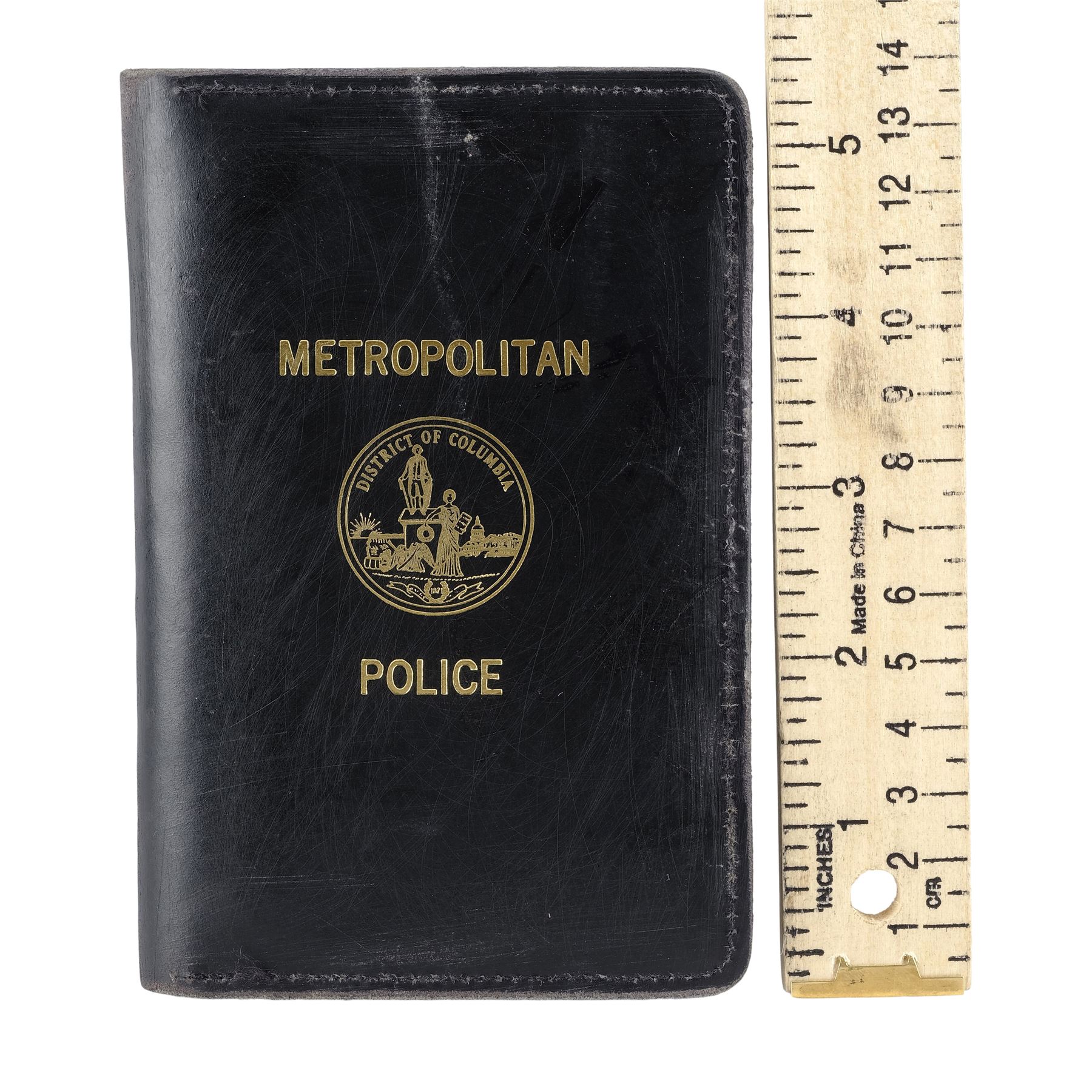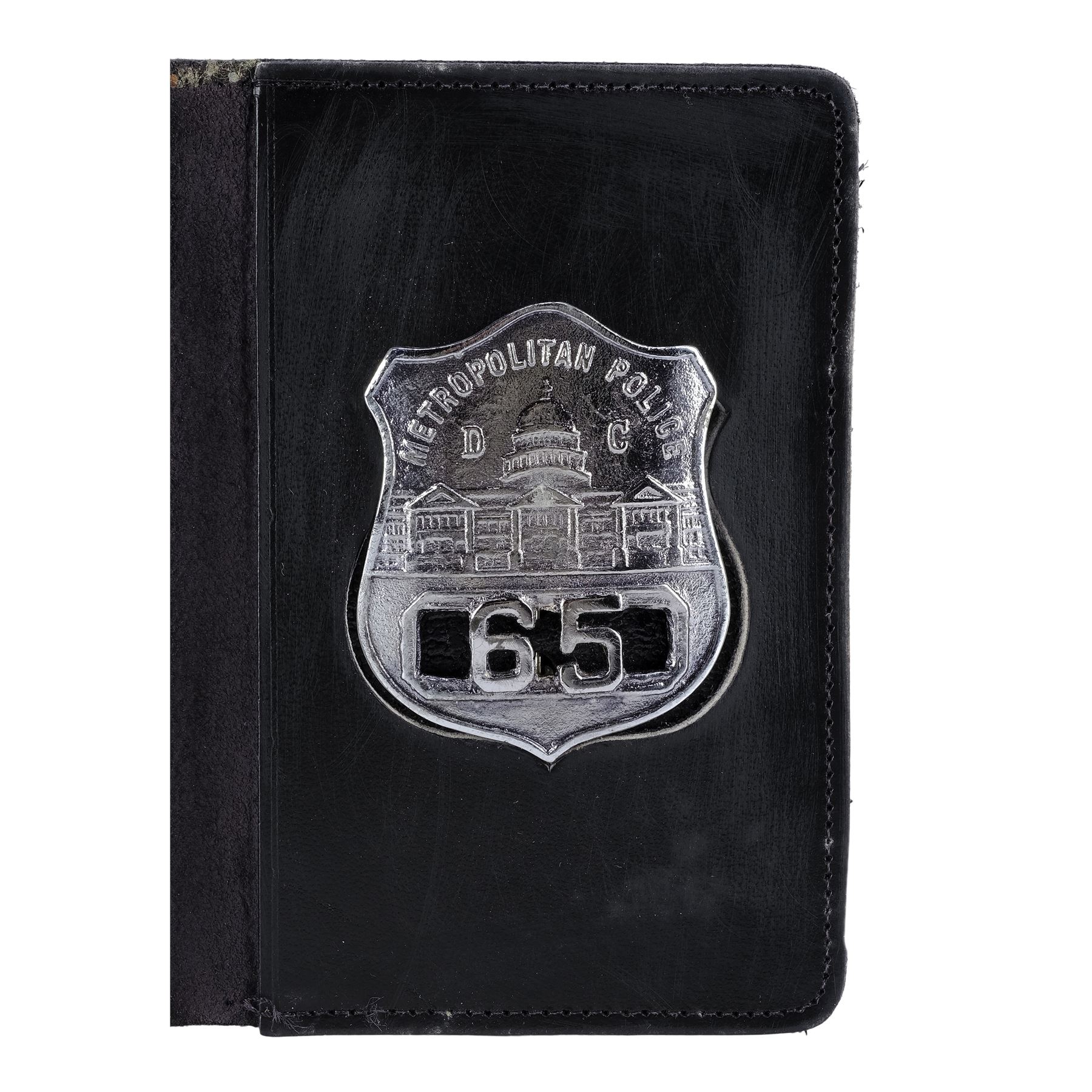 This black leather billfold is labeled "Metropolitan Police" in gold-color print on the front and inset with a Metropolitan Police badge engraved "65" on the interior. It contains printed two pages of a "Metropolitan Police Department" ID, one labeled "WILLIAM KINDERMAN" and one featuring Kinderman's signature, picture, biographical details, and the stamped date "Jan 11 1990." The leather exhibits bending and some separation along its outer seems from production use and age. Dimensions: 3.25" x 5.75" x 0.75" (8.25 cm x 14.25 cm x 1.75 cm)
