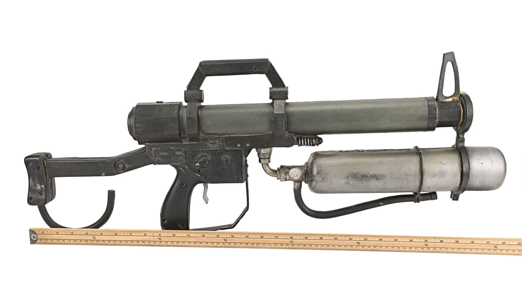 FAST & FURIOUS 6 (2013) - Brian O'Conner's (Paul Walker) Stunt Grapple Hook Gun - Brian O'Conner's (Paul Walker) stunt grapple hook gun from Justin Lin's action crime sequel Fast & Furious 6. O'Conner and other main characters held and fired grapple guns throughout the film, including during the action-packed runaway chase finale. This style of grapple hook gun was only used by O'Conner as he and his allies brought the plane down. The gun has a foam rubber interior and firm rubber exterior that has been painted to resemble metal. Dimensions: 32.75" x 12.5" x 3.5" (83 cm x 32 cm x 9 cm)