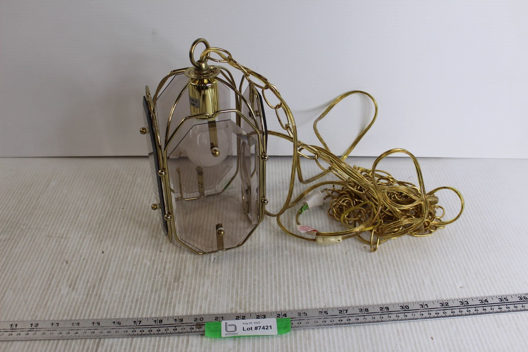 80s-Style Hanging Pendent Light Fixture -- Glass and Brass