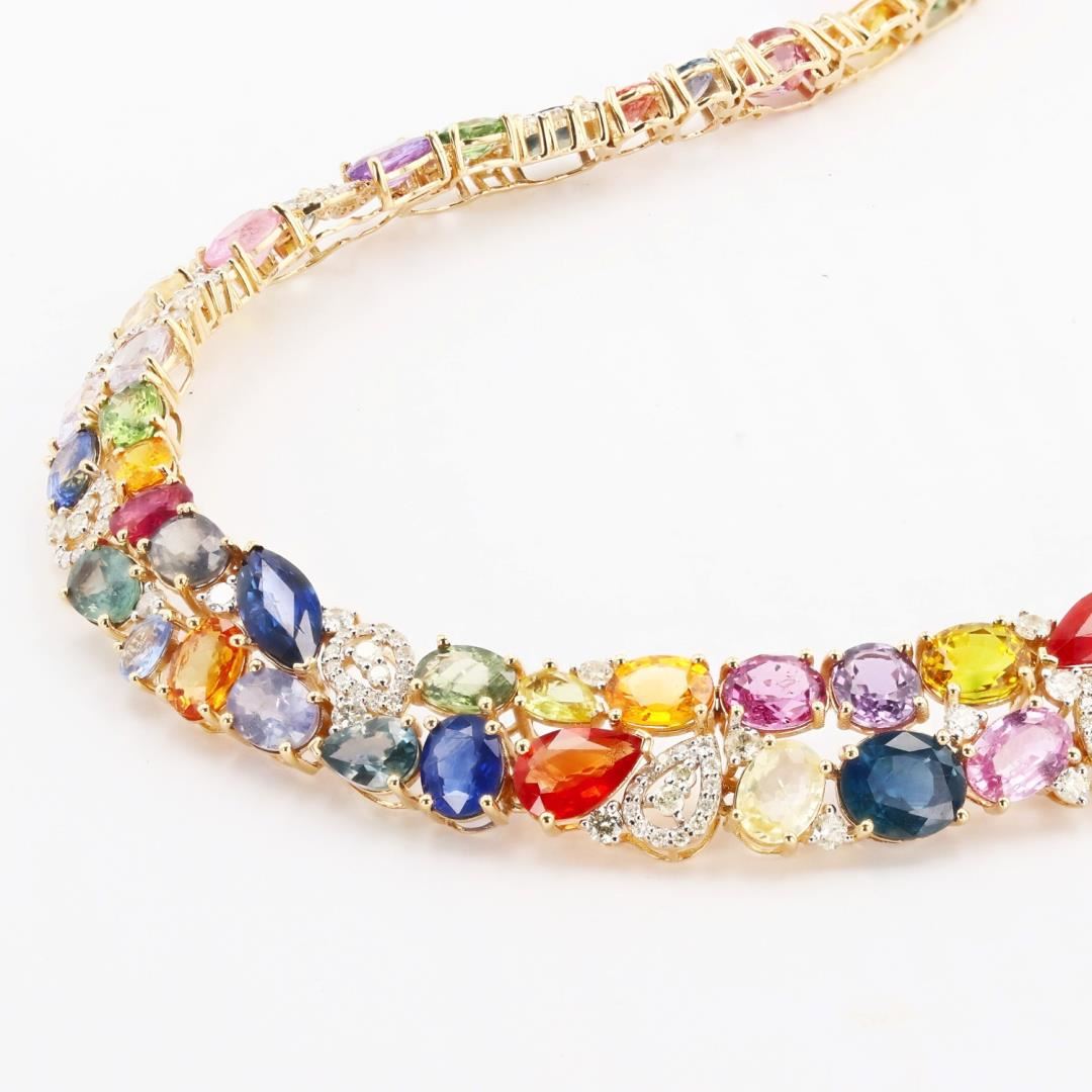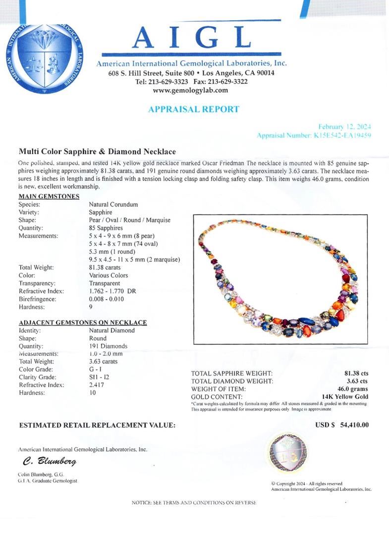One polished, stamped, and tested 14K yellow gold necklace marked Oscar Friedman The necklace is mounted with 85 genuine sapphires weighing approximately 81.38 carats, and 191 genuine round diamonds weighing approximately 3.63 carats. The necklace measures 18 inches in length and is finished with a tension locking clasp and folding safety clasp. This item weighs 46.0 grams. condition is new, excellent workmanship. #MAIN GEMSTONES# Species: Natural Corundum Variety: Sapphire Shape: Pear / Oval / Round / Marquise Quantity: 85 Sapphires Measurements: 5 x 4 - 9 x 6mm (8 pear), 5 x 4 - 8 x 7mm (74 oval), 5.3mm (1 round), 9.5 x 4.5 - 11 x 5mm (2 marquise) Total Weight: 81.38 carats Color: Various Colors Transparency: Transparent Refractive Index: 1.762 - 1.770 DR Birefringence: 0.008 - 0.010 Hardness: 9 #ADJACENT GEMSTONES ON NECKLACE# Identity: Natural Diamond Shape: Round Quantity: 191 Diamonds Measurements: 1.0 - 2.0mm Total Weight: 3.63 carats Color Grade: G-I Clarity Grade: SI1-I2 Refractive Index: 2.417 Hardness: 10 TOTAL SAPPHIRE WEIGHT: 81.38 cts TOTAL DIAMOND WEIGHT: 3.63 cts WEIGHT OF ITEM: 46.0 grams GOLD CONTENT: 14K Yellow Gold #LREF-15542