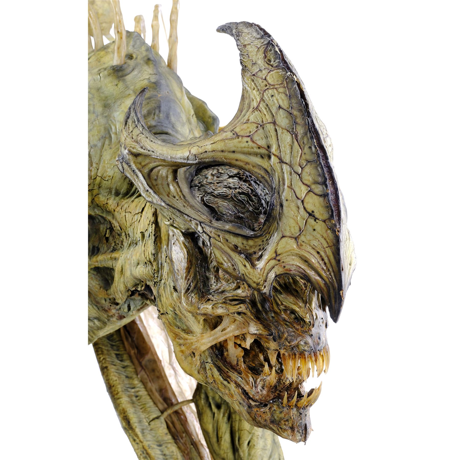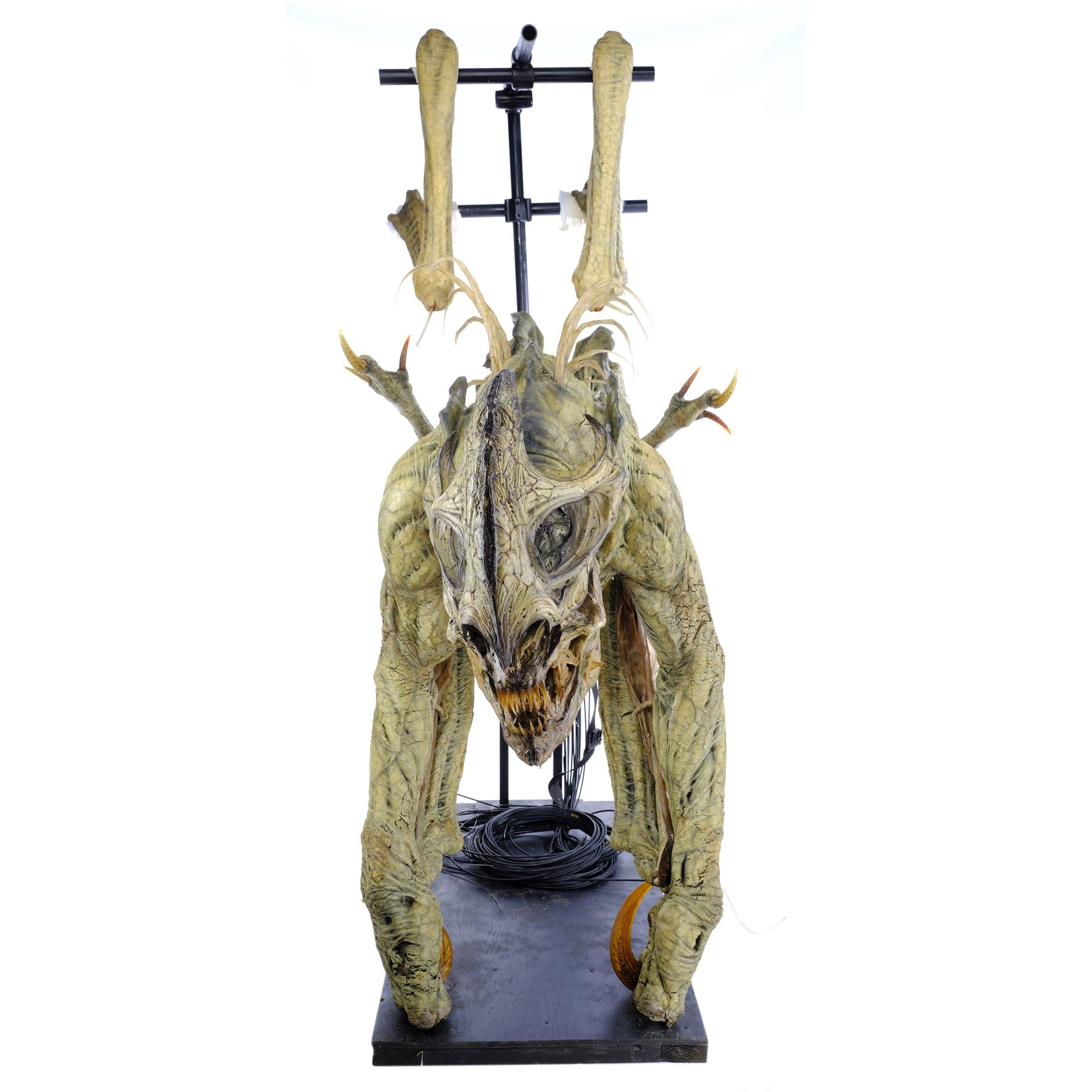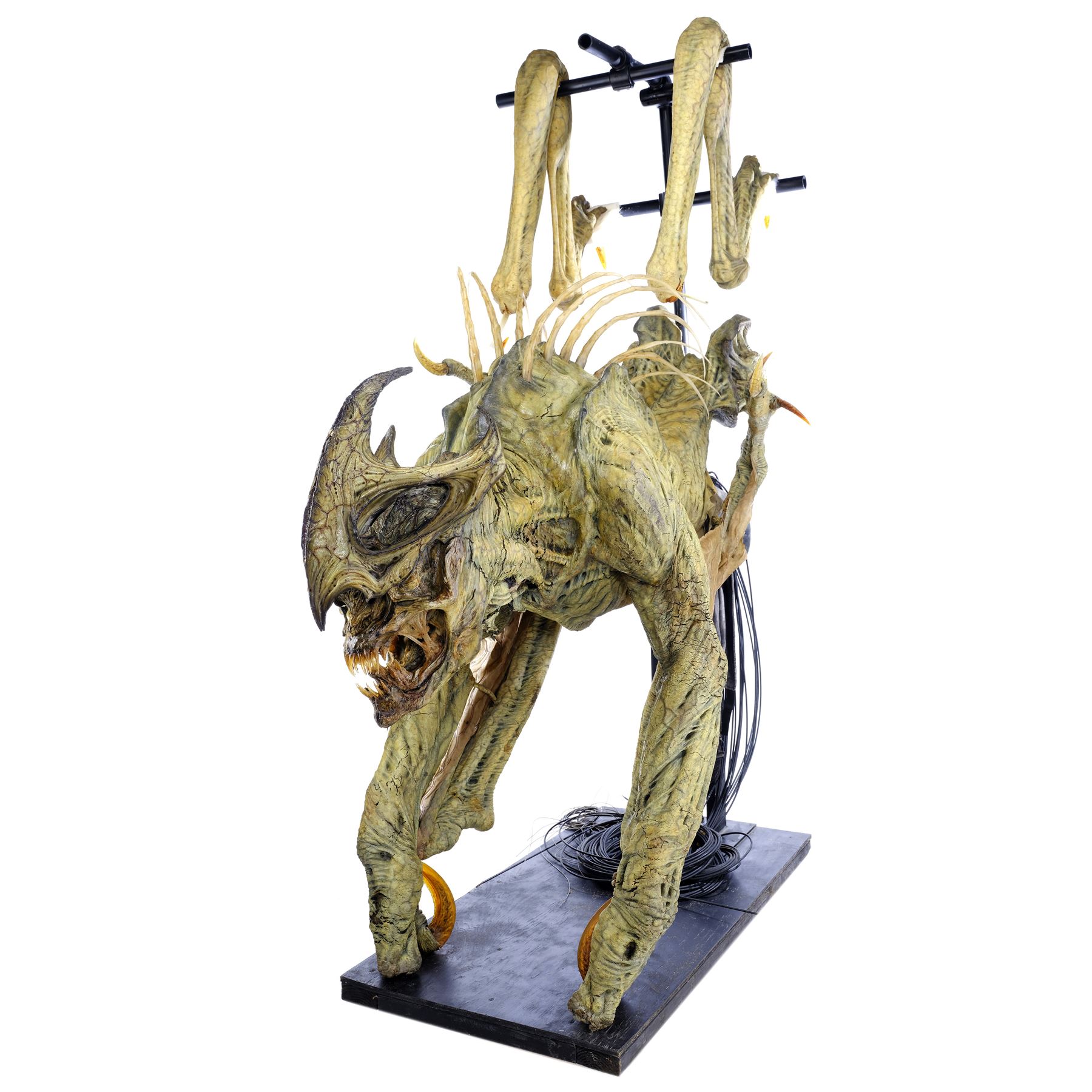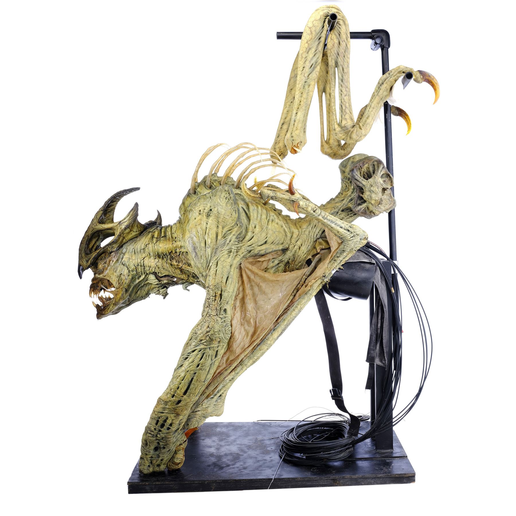 This cave creature was created and fabricated by SFX company Patrick Tatopoulos Design. It is constructed primarily from foam latex with rubber wings, a fiberglass skull, and long resin spikes and claws. Puppeteering wires designed for a performer to move the "legs" are set into a puppeteer's body harness concealed inside the belly. The creature is hand-painted yellow, pink, and green, and distressed by production to appear rotten and mutated throughout. It is affixed with an elastic harness mounted to a steel display rig screwed into a wood base. The back legs are presented loose from the body.