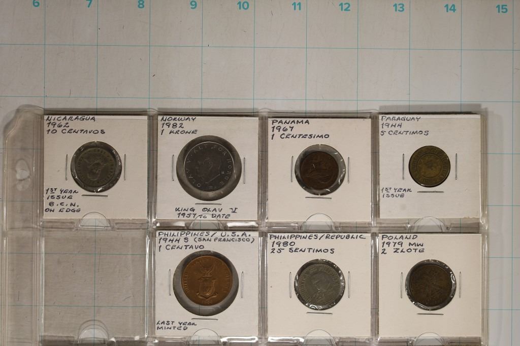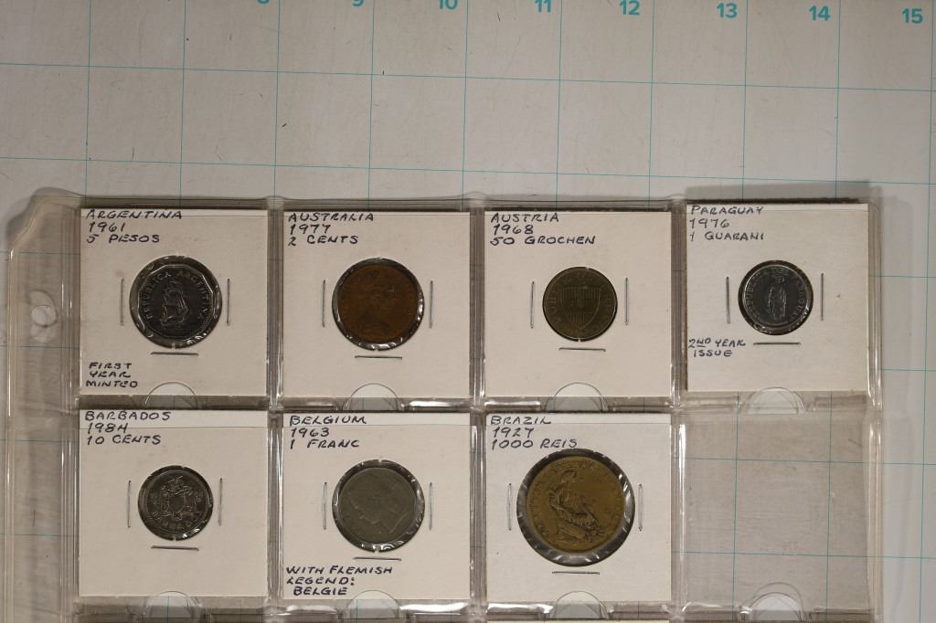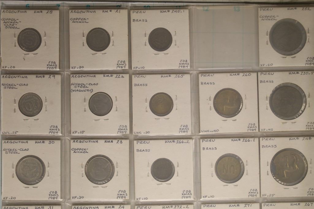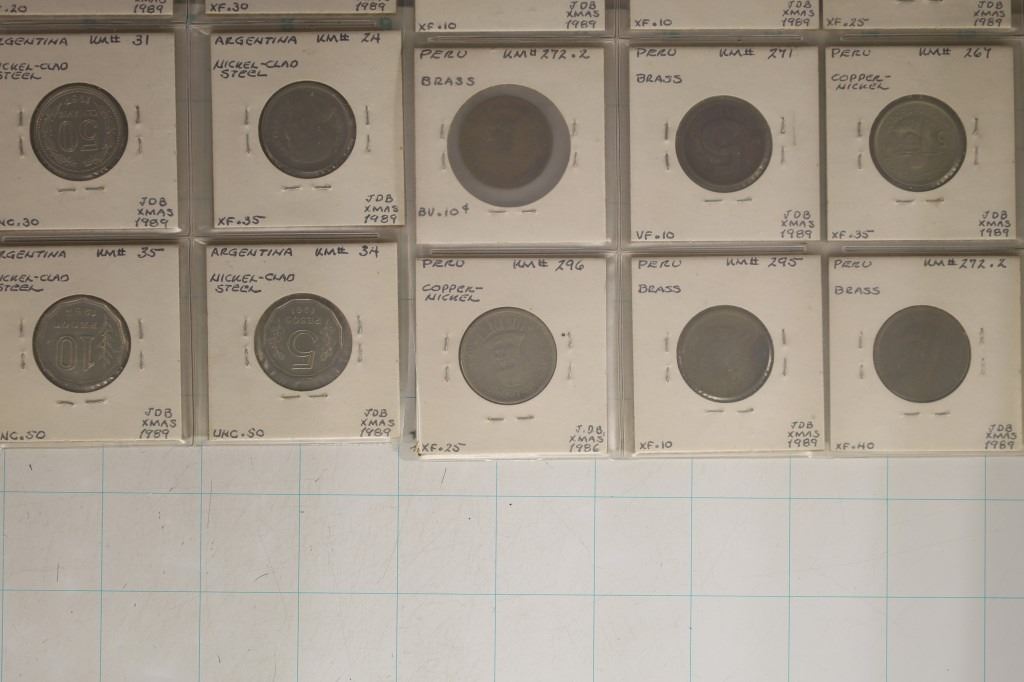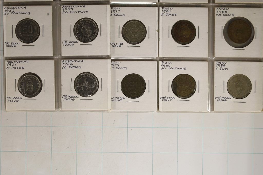 IN PLASTIC SLEEVES. 11 ARGENTINA (1952-1962) 5 CENTAVOS - 10 PESOS WITH ALMOST ALL BEING BETTER CONDITION, 14 PERU (1958-1980) 5 CENTAVOS-FIVE SOLES-1/2 SOLES-10 CENTAVOS-50 CENTIMOS-1 INTI ETC... SOME 1ST YEAR