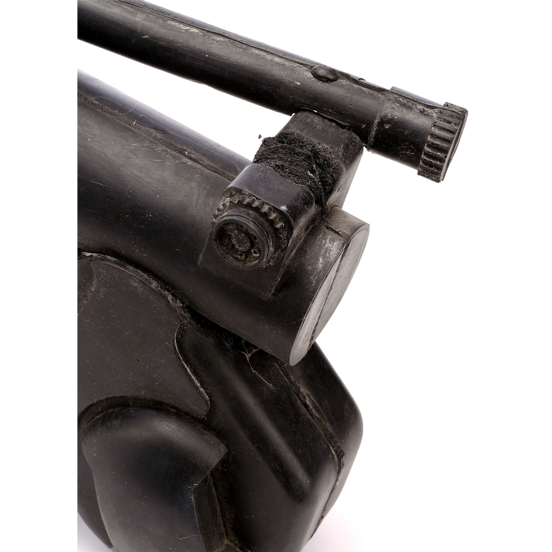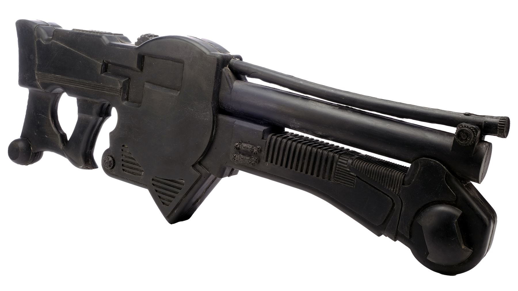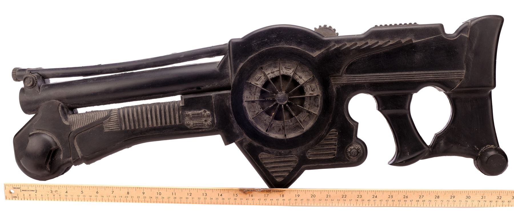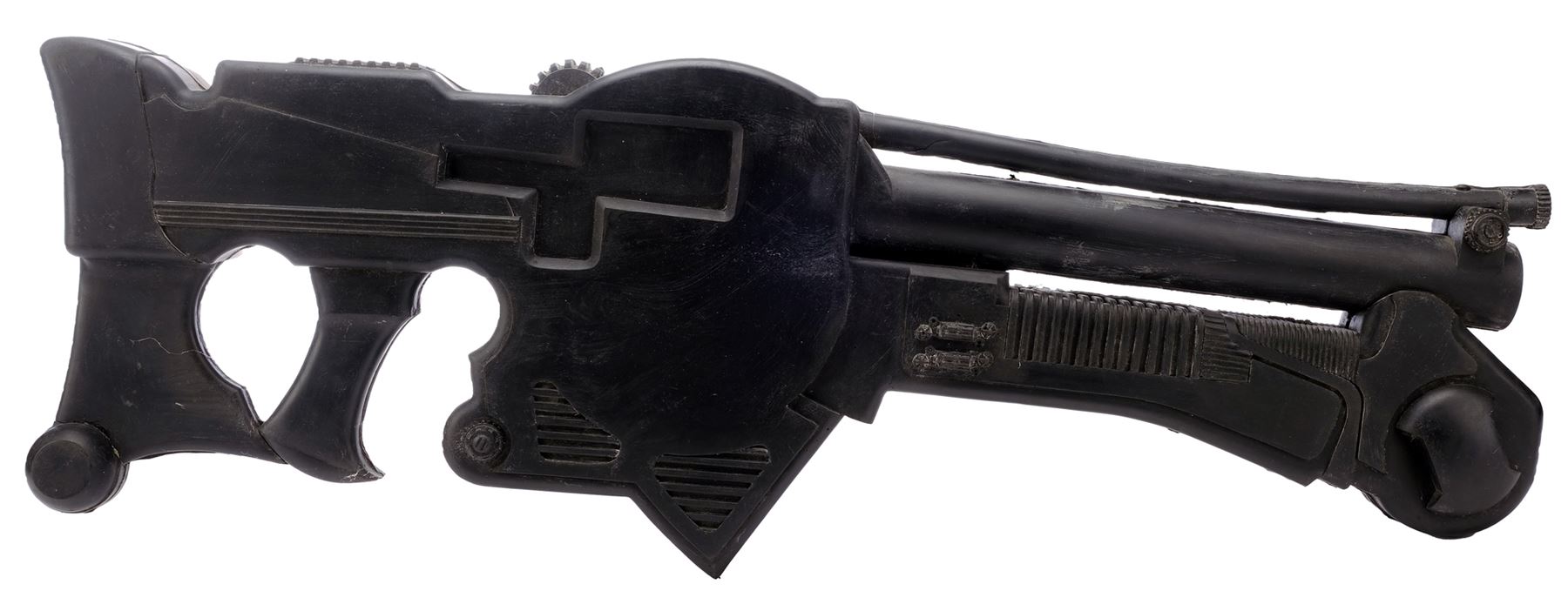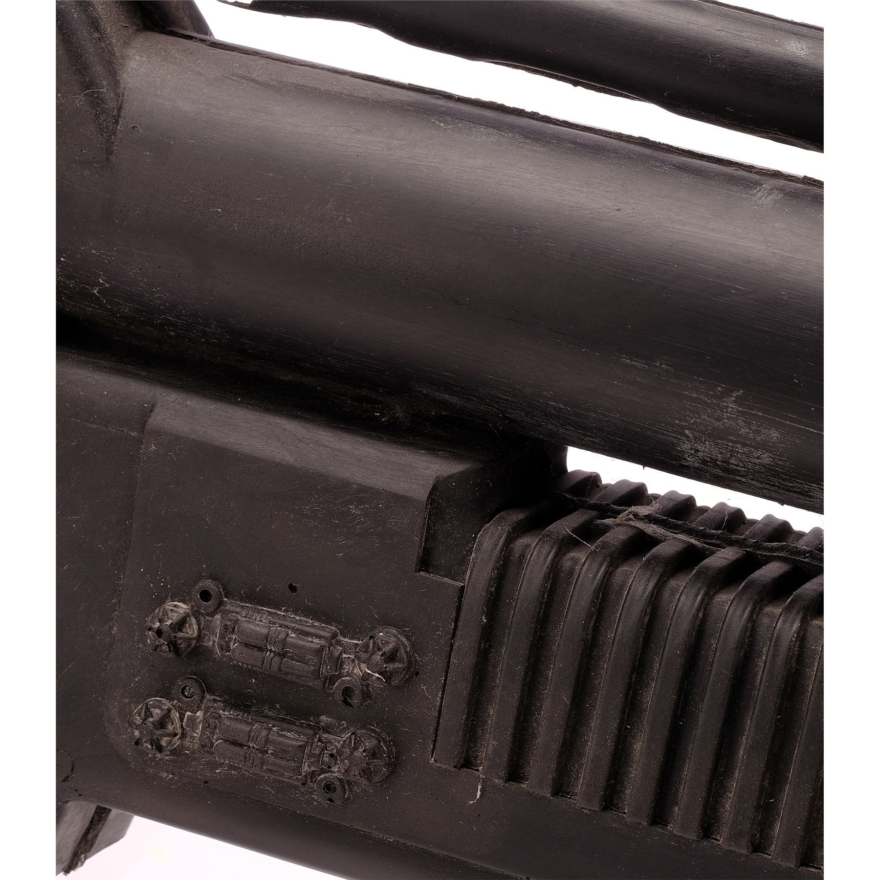 Custom-made for the production, this unfinished stunt rifle is constructed of dense rubber painted completely black with ribbed detailing along the sides and rail detailing along the stock and barrel. The weapon exhibits splitting on the barrel and grip from age, as well as grime throughout from exposure. Dimensions: 32" x 11.25" x 3" (81.5 cm x 28.75 cm x 7.75 cm)