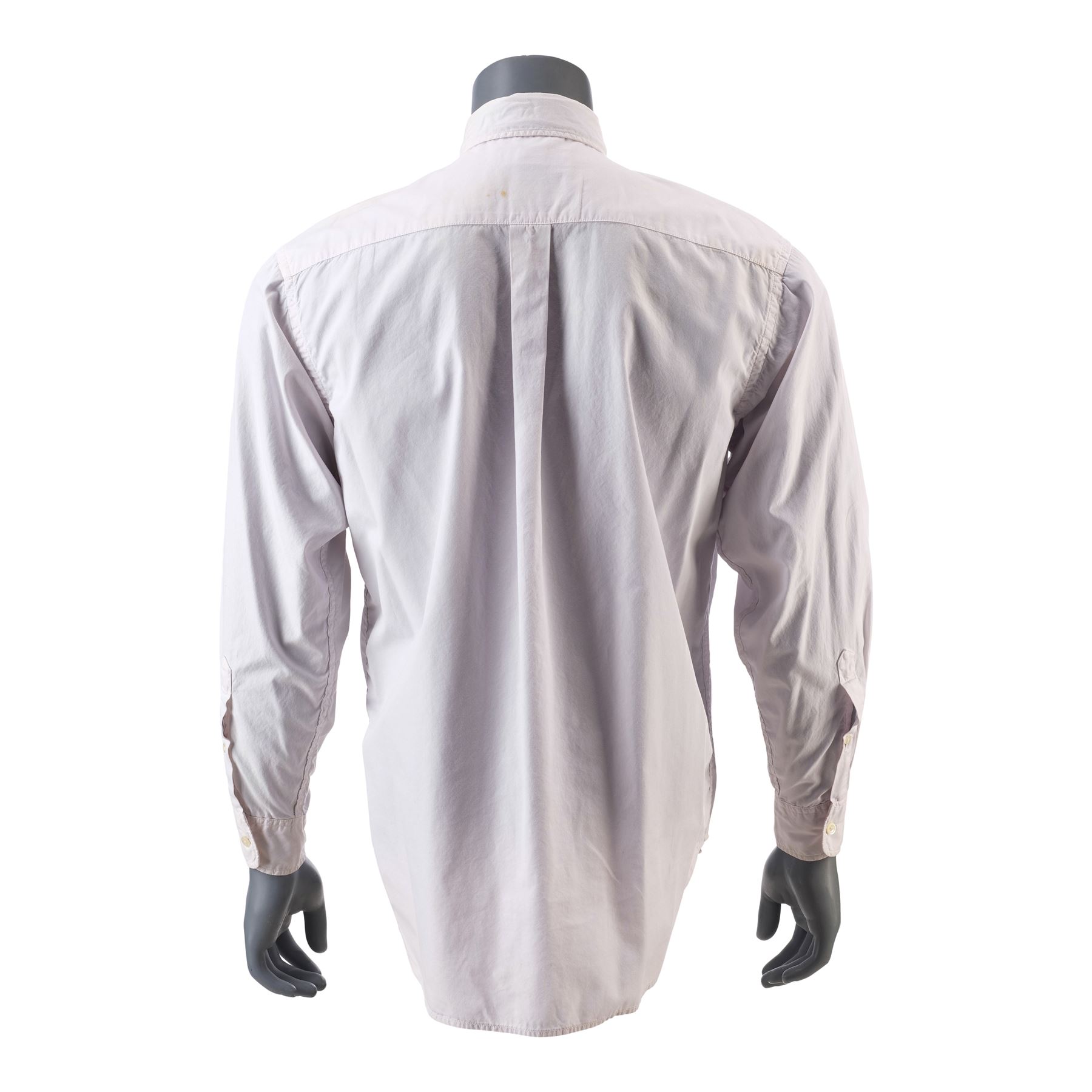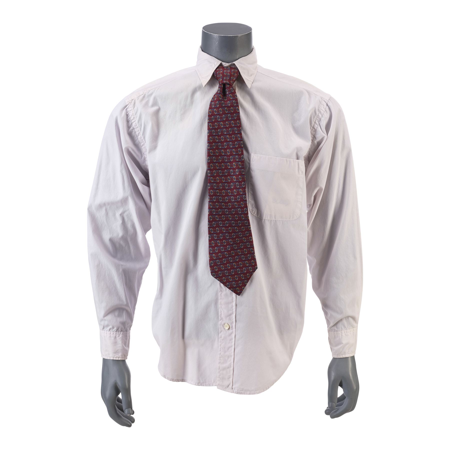 This lot consists of one white cotton button-up long-sleeve shirt from Banana Republic (Size S) with front pocket, and a satin patterned tie. Also included is a production tag hand-marked "Gap w/o Blood." Production intentionally distressed this shirt to appear grimy and stained. This lot exhibits discoloration on the tag.