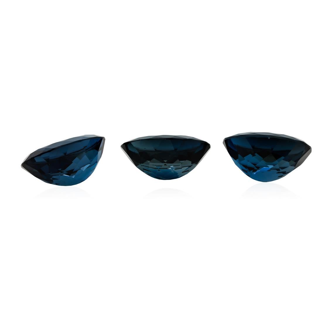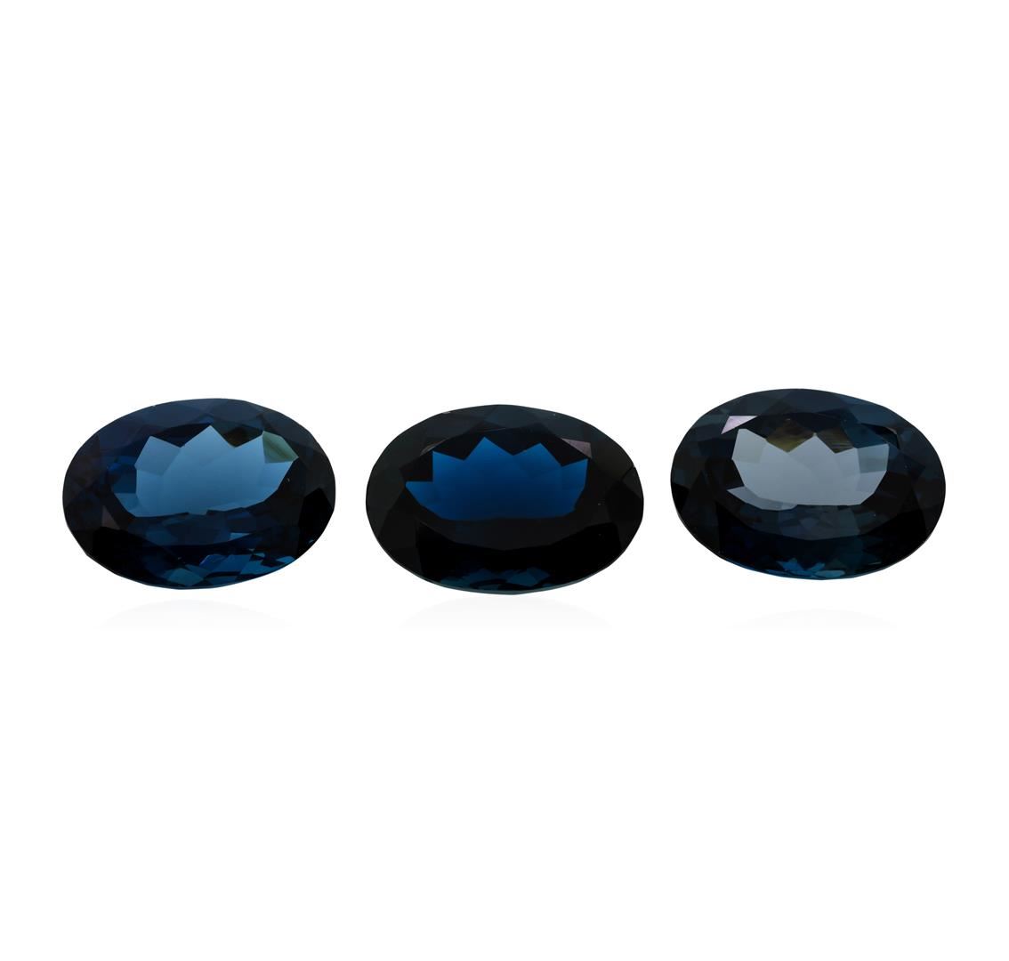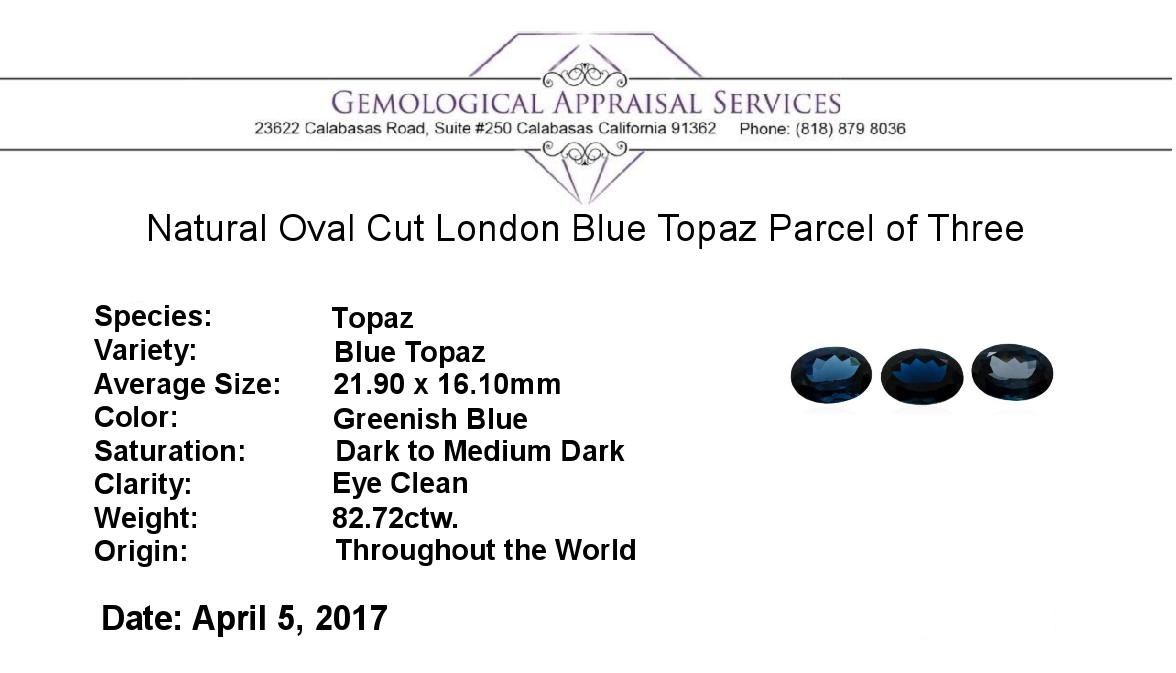 One natural oval cut london blue topaz parcel of three with an exact weight of 82.72ctw., clarity is eye clean, greenish blue, dark to medium dark. Gemological Appraisals Services estimates the retail value at $1654.4 GAS Appraised.