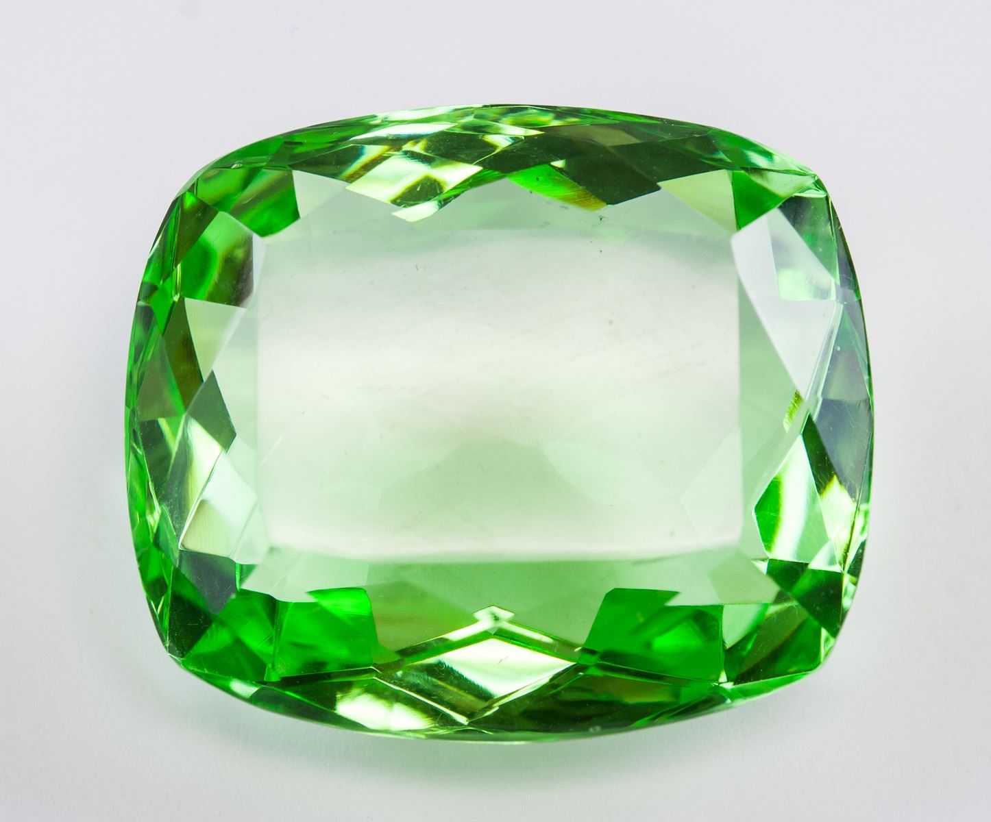 One (1) 82.95 ct cushion cut green natural peridot. Origin: Brazil. Accompanied with GGL certificate. 30.18 x 25.97 x 16.64 mm.