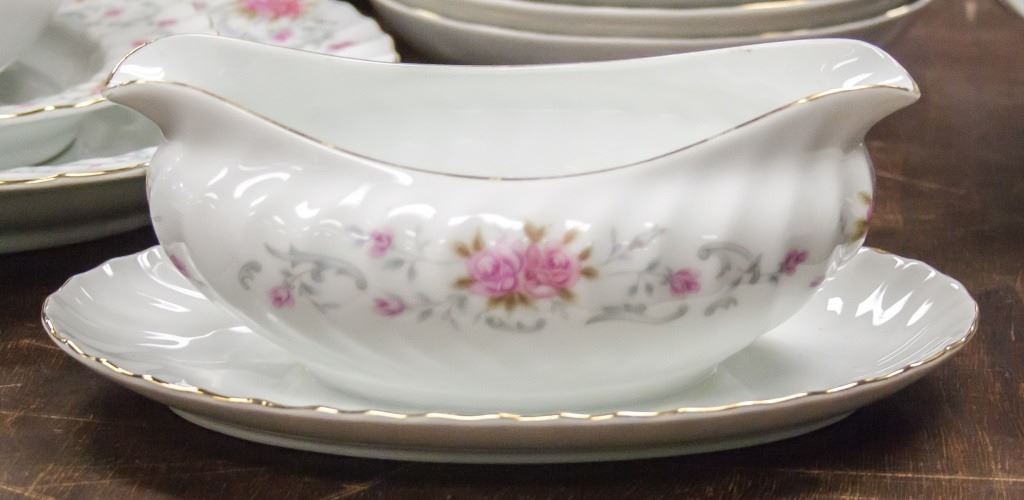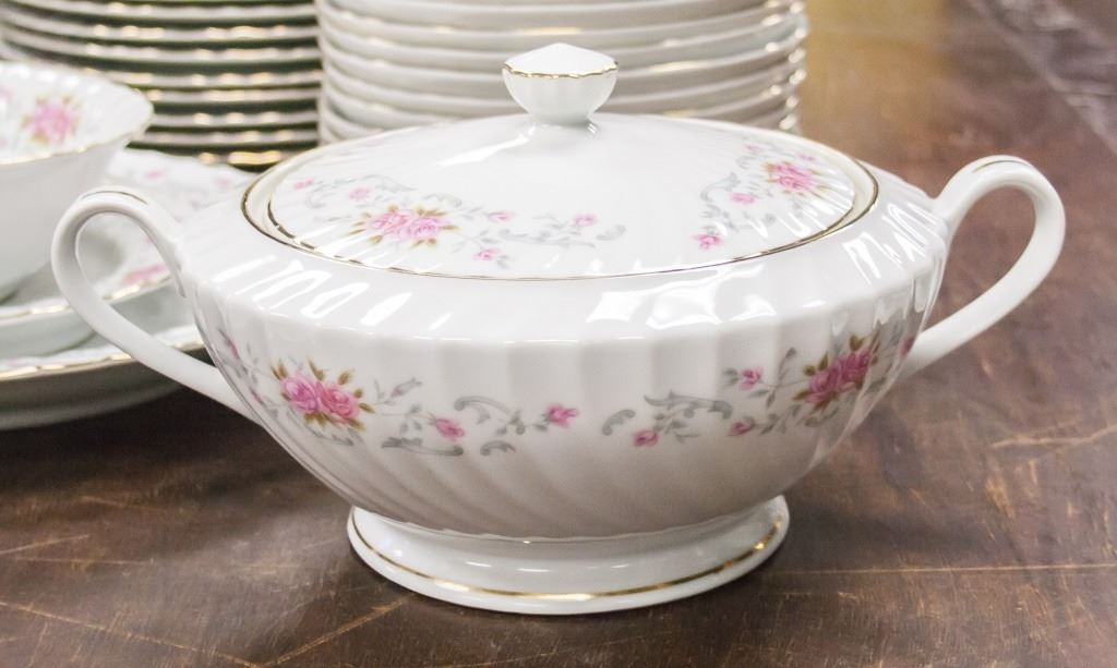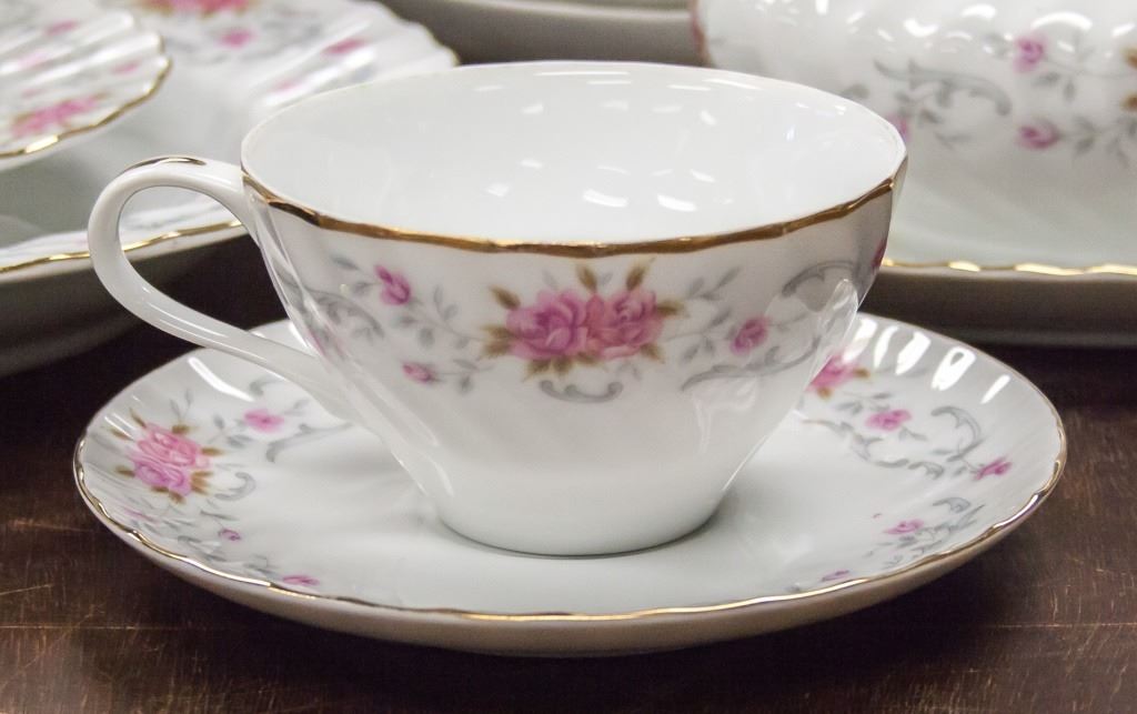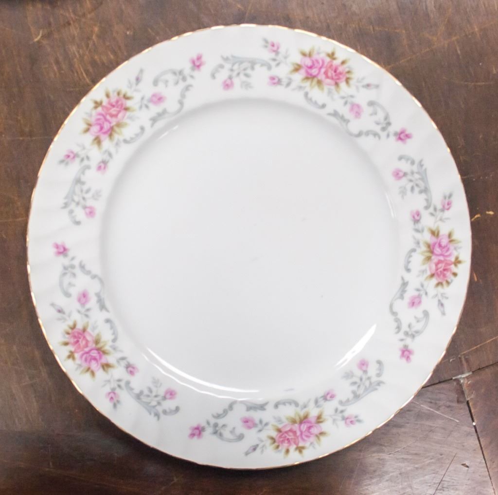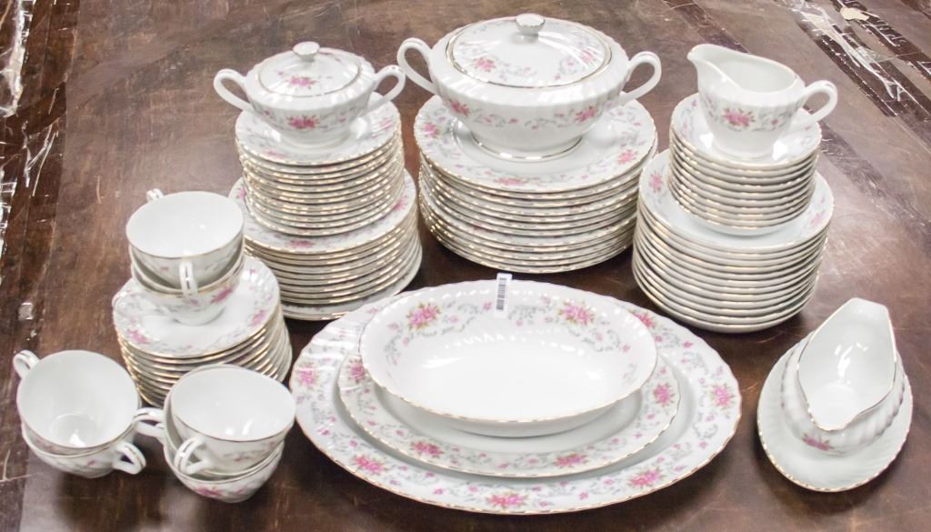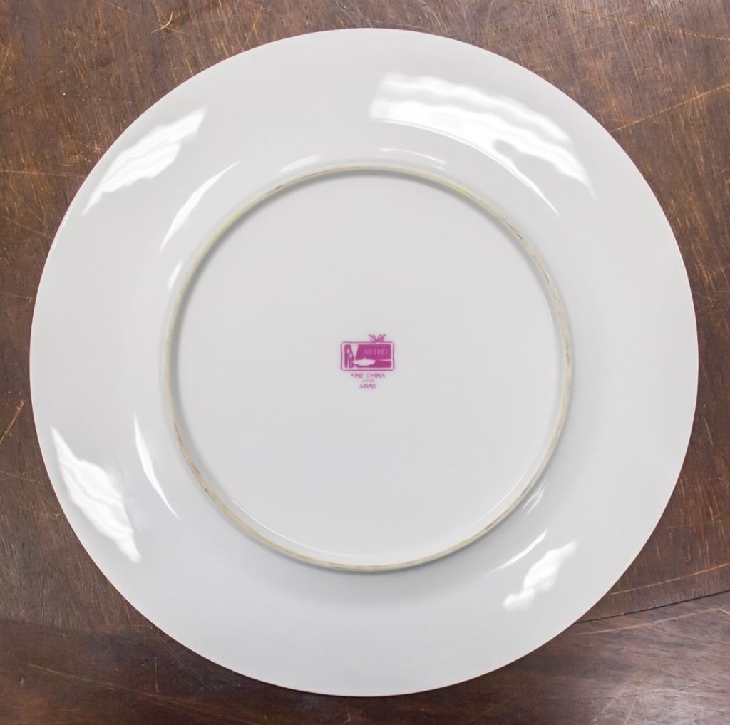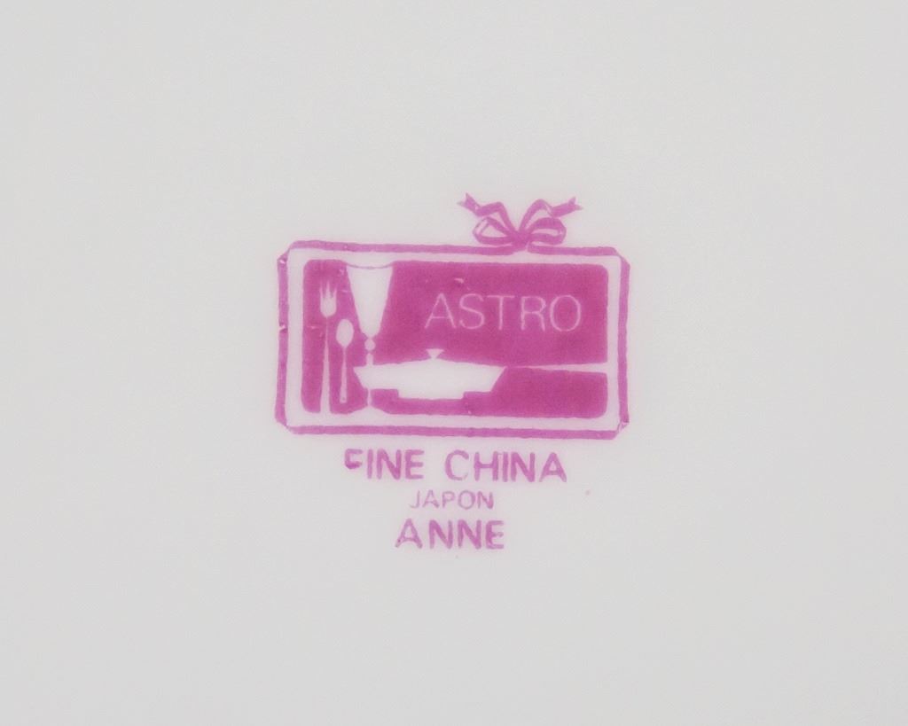 82-piece dishware, including plates, cups, saucers. With pink floral pattern on white. "ASTRO FINE CHINA JAPON ANNE" stamped on base. L: 41 cm. 26.5 kg.