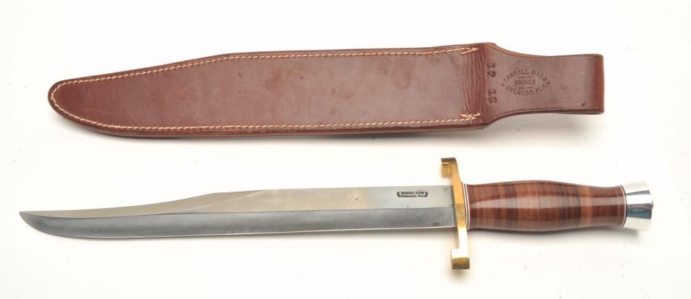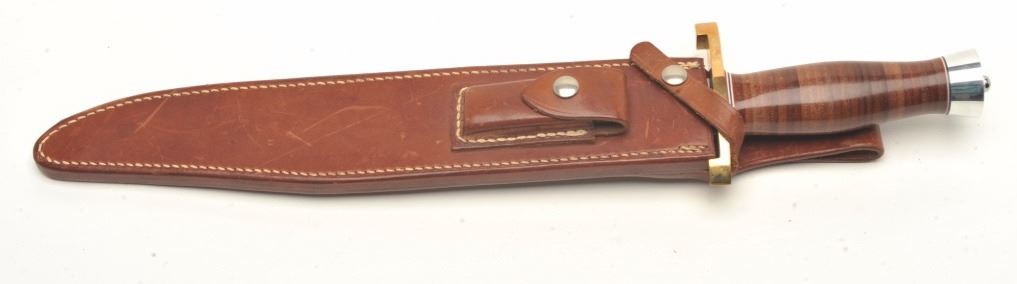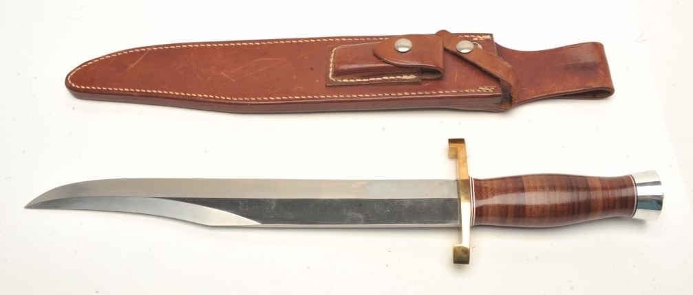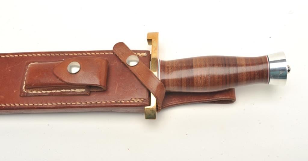 knife with radical clip point and measuring 18 3/8” overall with a 12 7/8” blade!! Over 7 ½” clip to blade with low sweep. Brass guard with aluminum pommel. Near fine blade condition with very good scabbard that is well marked with stone included. The blade shows full dimensions with no sharpening or appreciable evidence of use. About 1 ½” wide blade at the widest point. A big and unusual Randall probably custom ordered. Est.: $350-$700