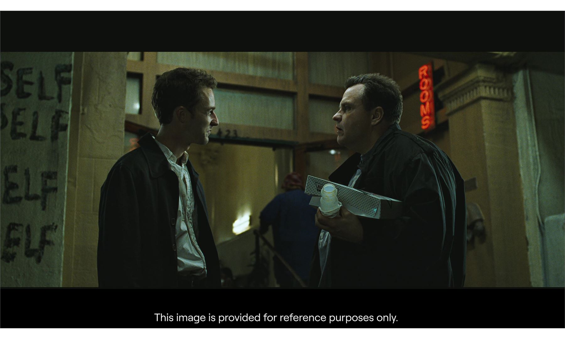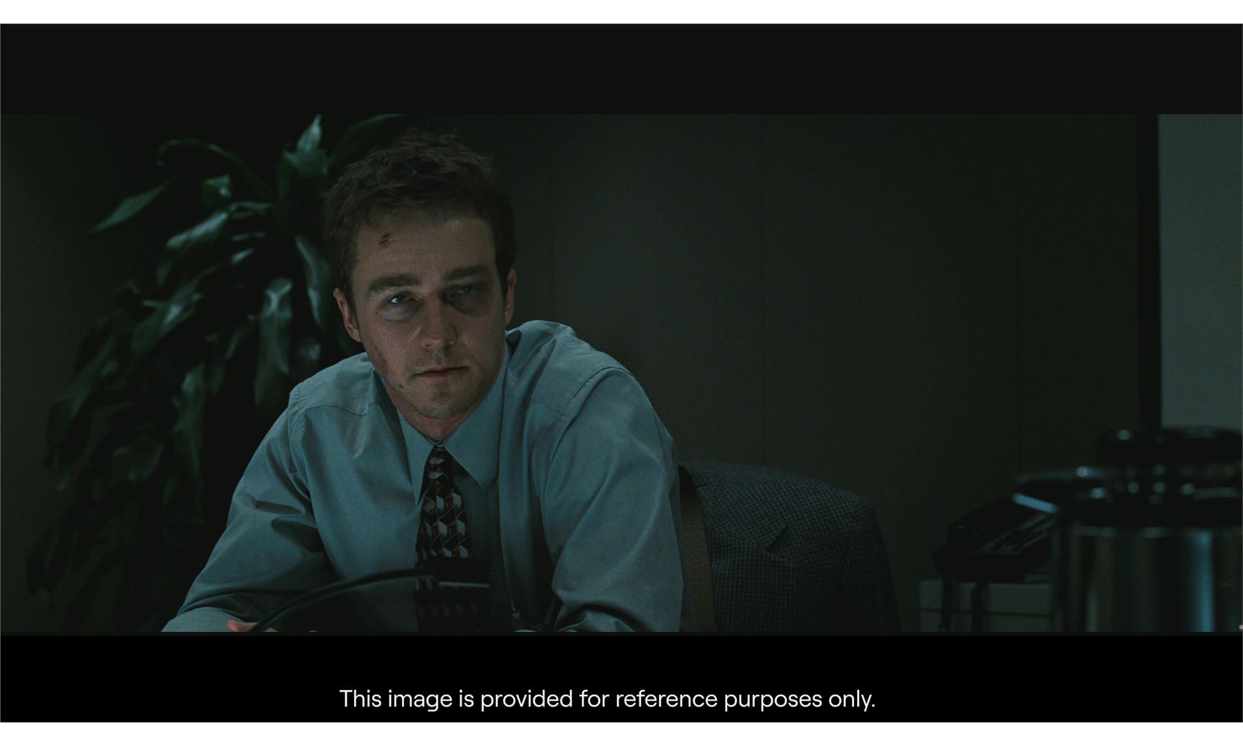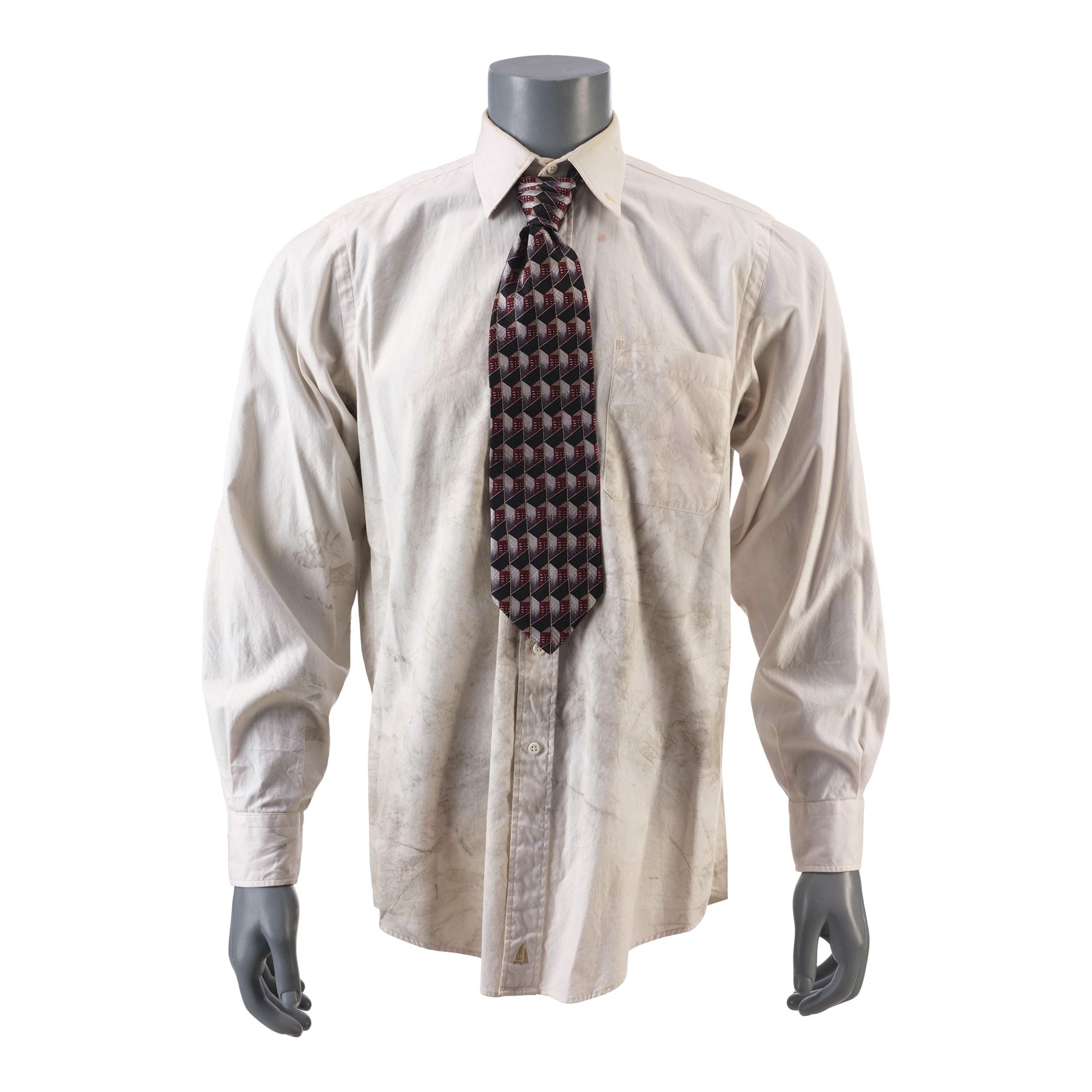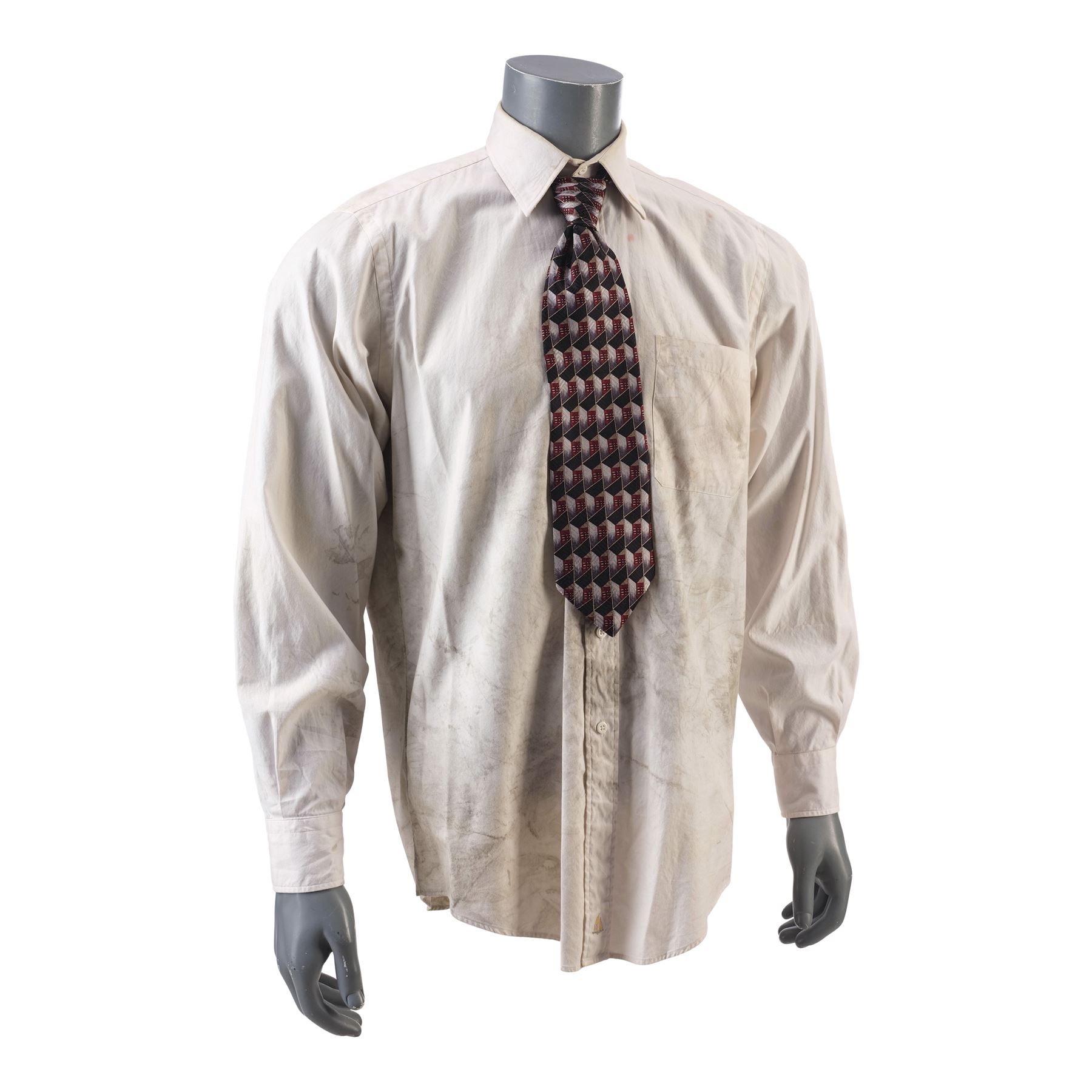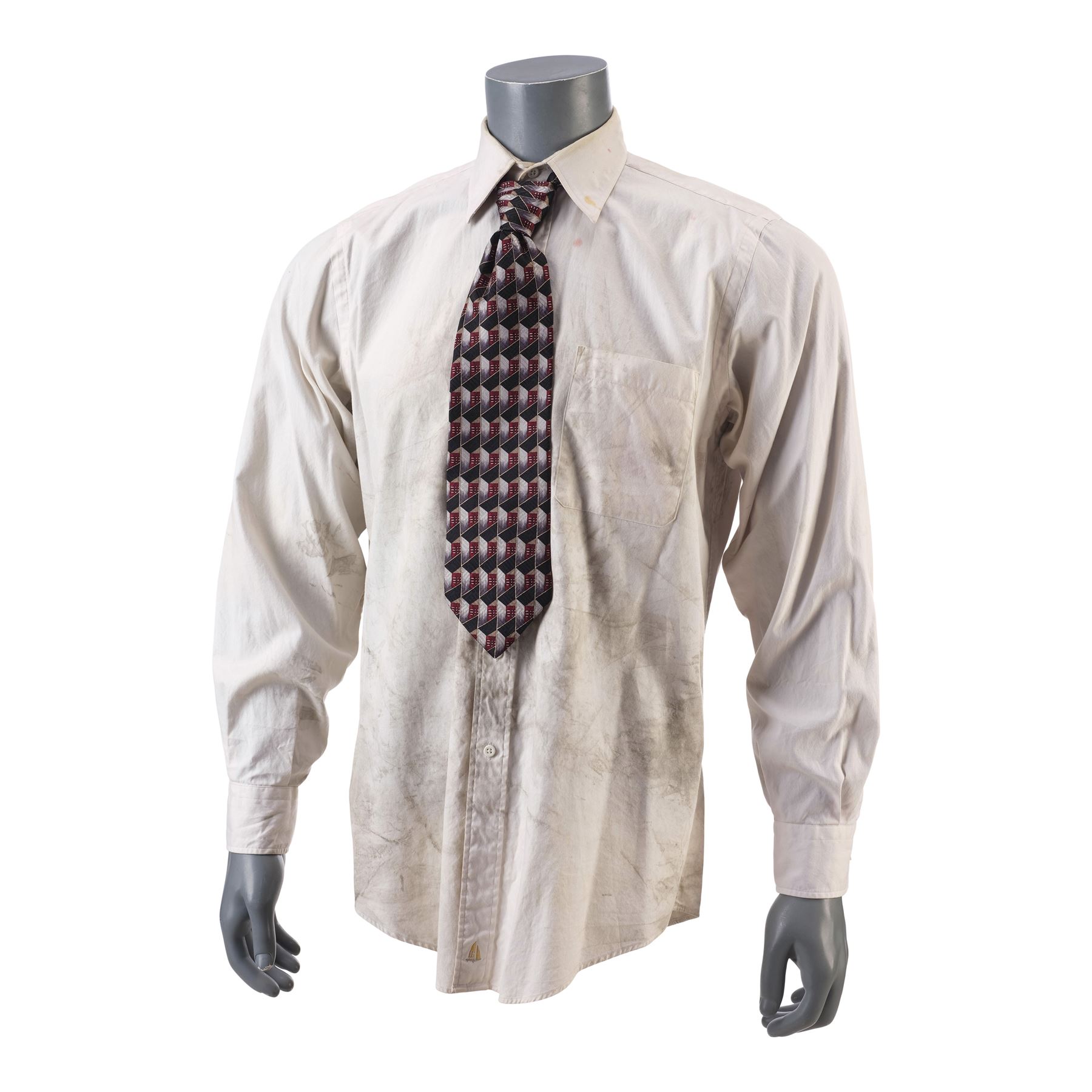 FIGHT CLUB (1999) - The Narrator's (Edward Norton) Distressed Dress Shirt and Tie - The Narrator's (Edward Norton) distressed shirt and tie from David Fincher's Fight Club. The Narrator wore his white button-up and geometric tie while he traveled for work, and eventually it became covered in grime as he fought Tyler Durden (Brad Pitt) after he came home to a burnt out apartment.