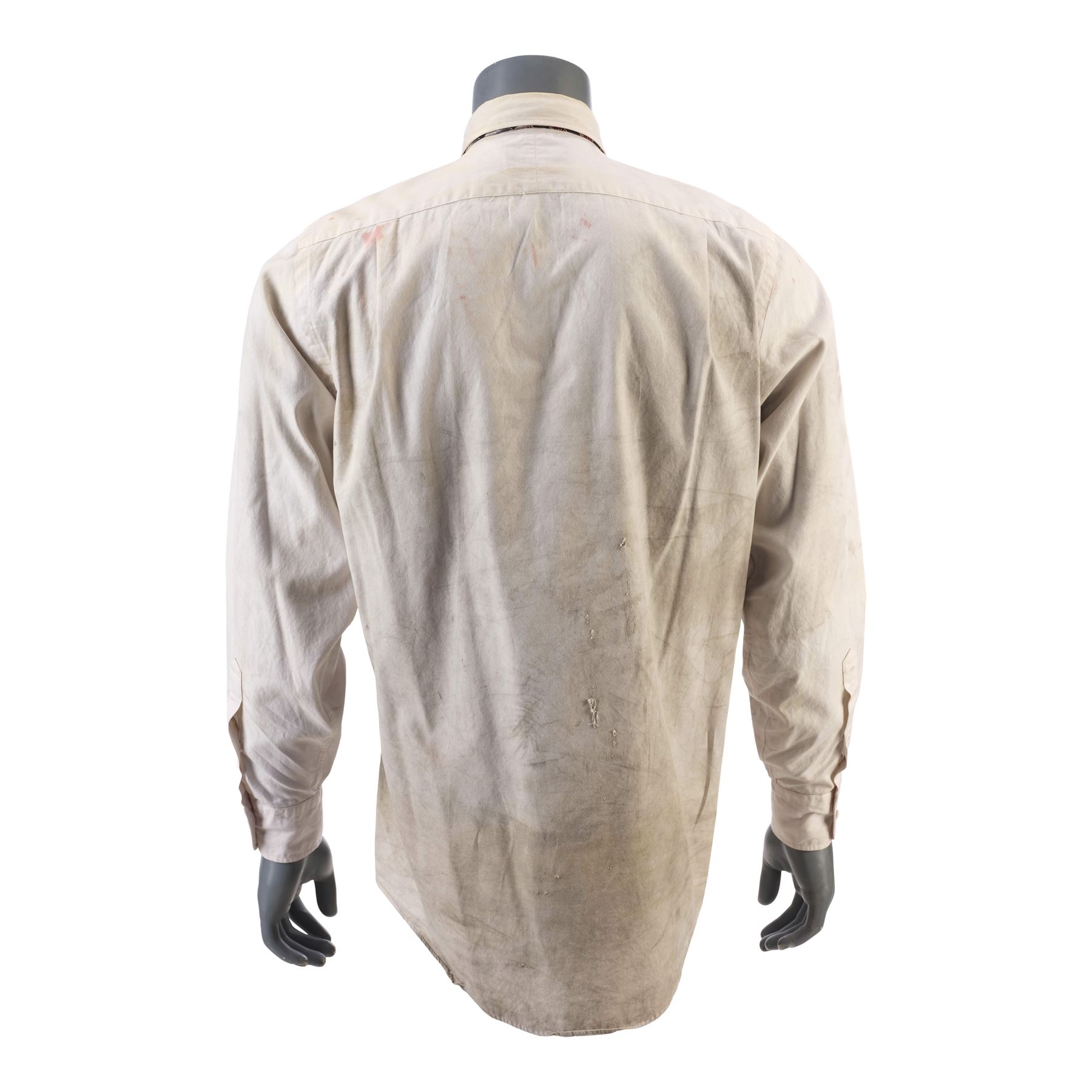 This lot consists of one white cotton button-up long-sleeve shirt with an embroidered sailboat at the bottom of the button placket, and a satin geometric-patterned tie. Also included is a production tag hand-marked "Sc 70A Actual Fight Jack." Production intentionally distressed this shirt to appear ripped, grimy, and a little bloody. This lot exhibits loose threads and mild blue discoloration at the back.