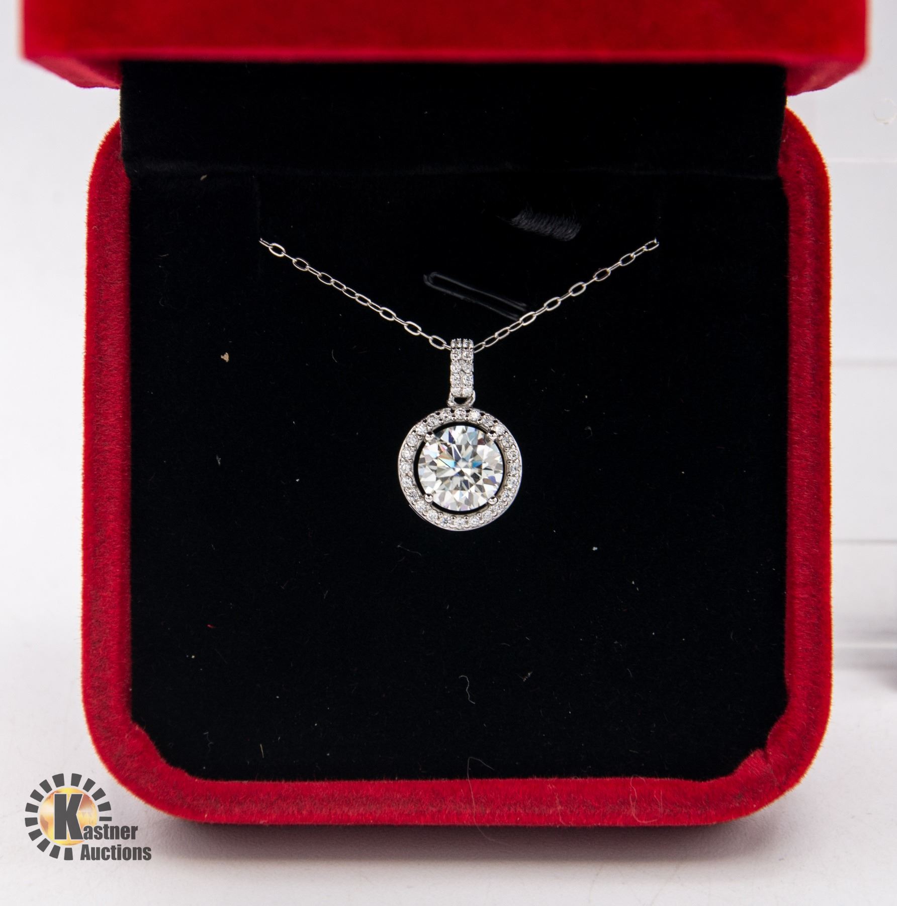VVS D ROUND CUT CENTER WITH A ROUND HALO WITH 24 CUBIC ZIRCONIUM AND 10 MORE IN THE BALE SET IN STERLING SILVER PENDANT AND NECKLACE
