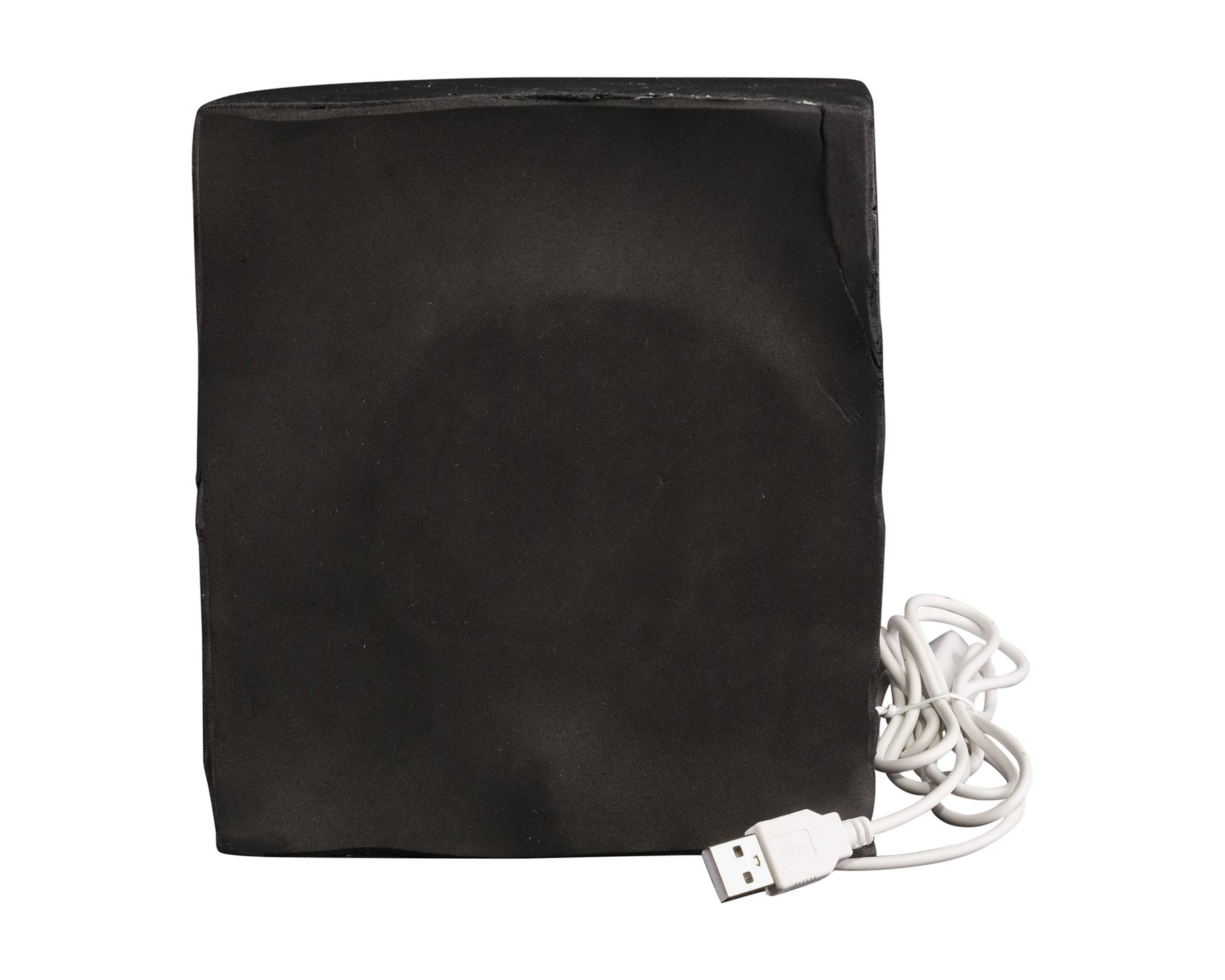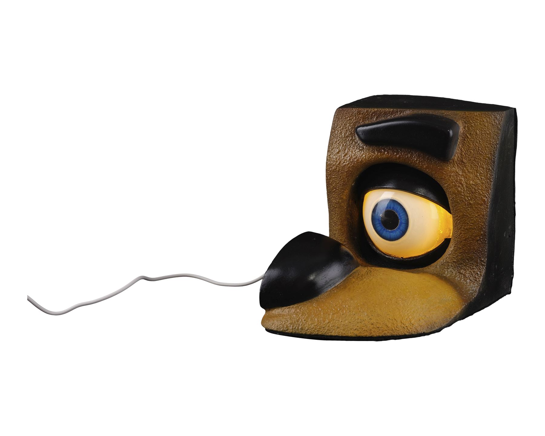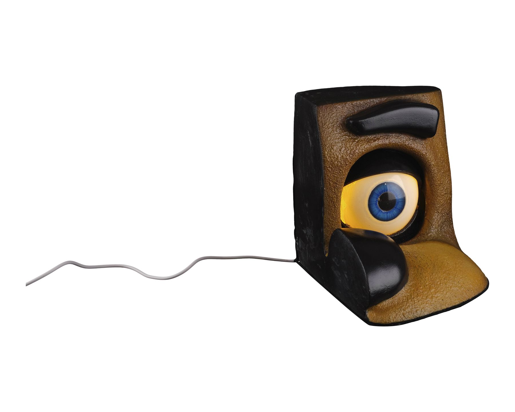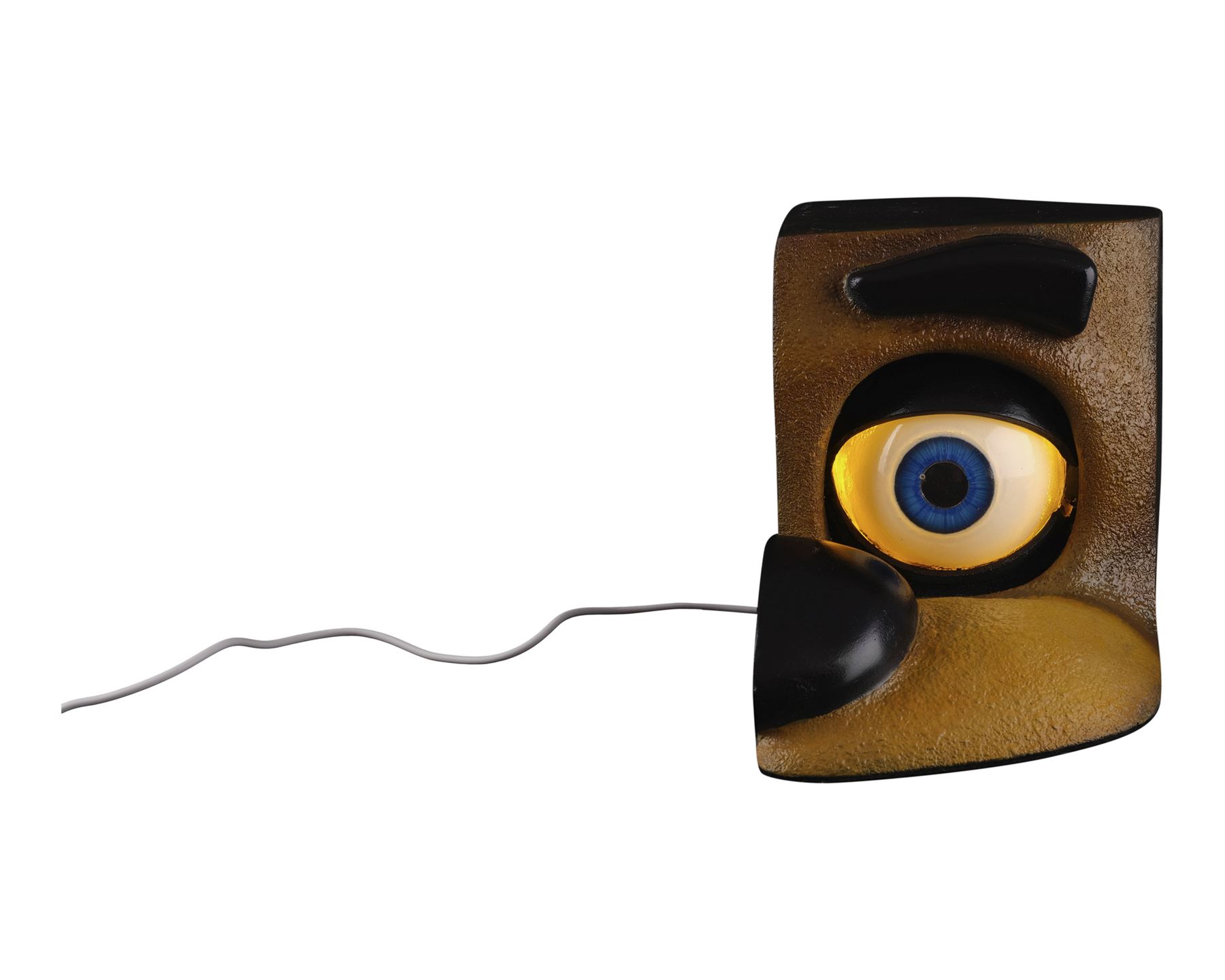 This hollow resin eye with dental acrylic coating features a black core and hand-painted blue iris. It comes set in a rigid foam and resin display shaped and painted like a quarter of Freddy's face that is backed with soft sheet foam and a felted bottom.The light behind the eye is powered by a USB cord with a button switch. This lot exhibits some bubbling in the dental acrylic from curing, adhesive residue on the display and a hole on the display near the foam back. Dimensions: 8" x 6" x 6.5" (20.25 cm x 15.25 cm x 17 cm)