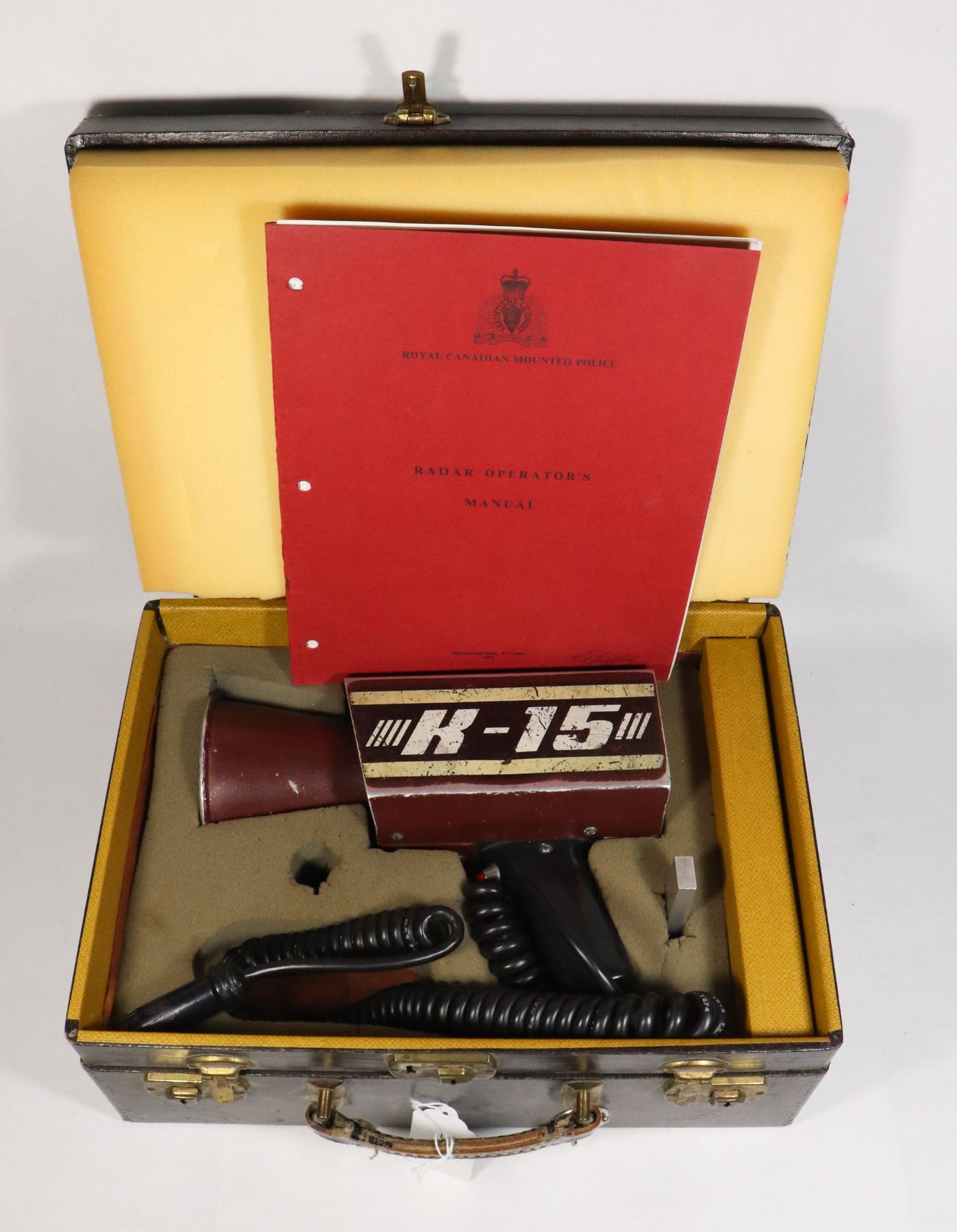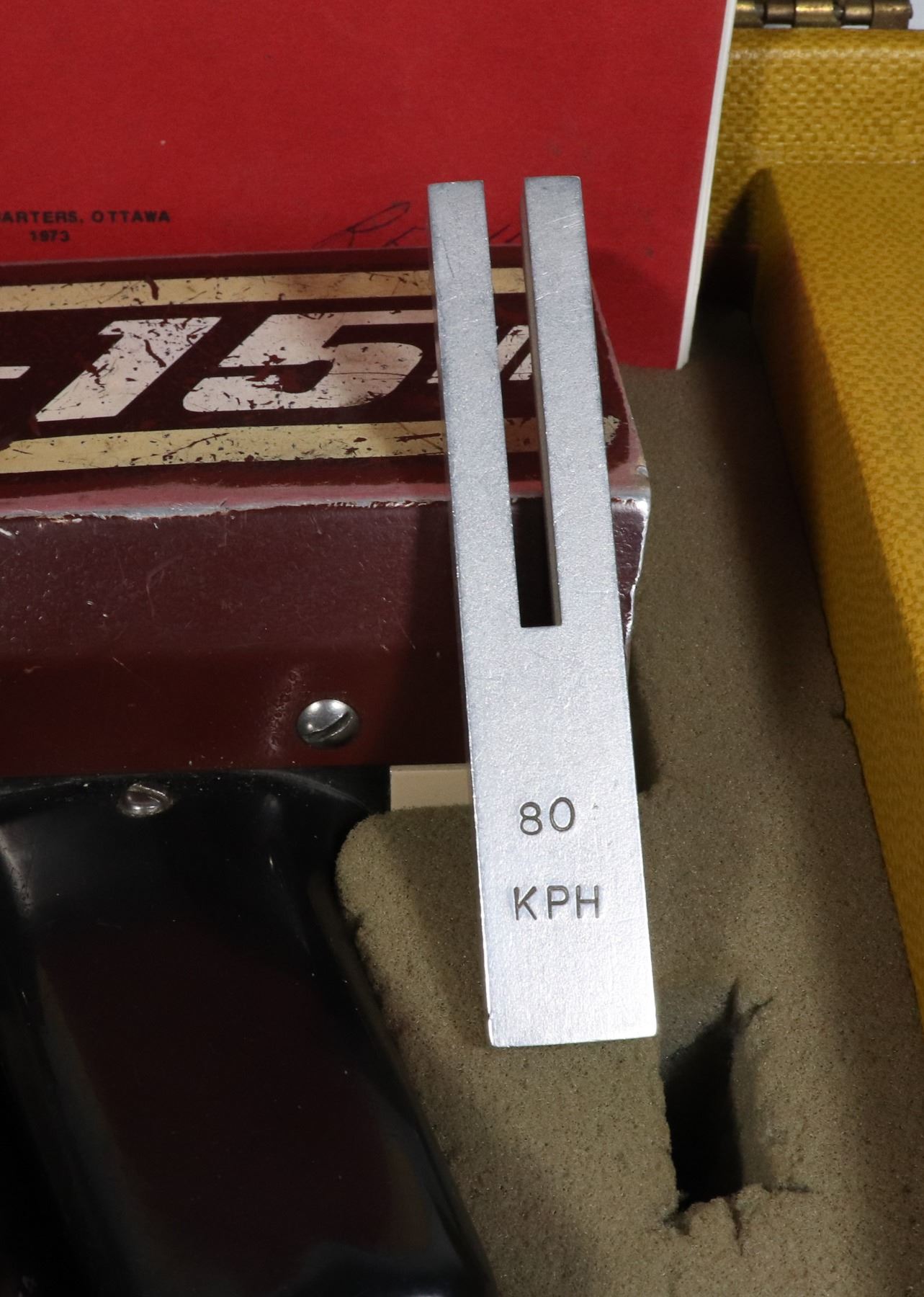 TURNS ON VINTAGE POLICE EQUIPTMENT IN CASE LATE 20TH CENTURY RADAR SPEEDOMETER
