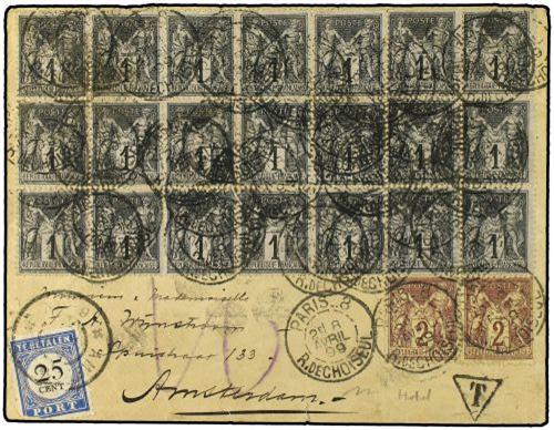 83(24),85(2) 1899 PARIS a AMSTERDAM. Espectacular franqueo con 24 sellos de 1 cto. y 2 sellos de 2 c