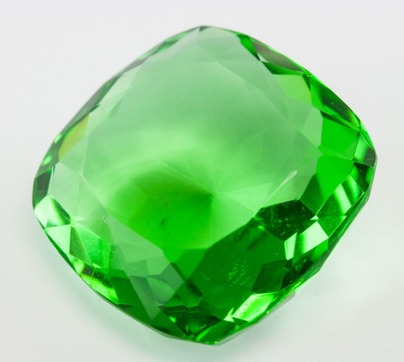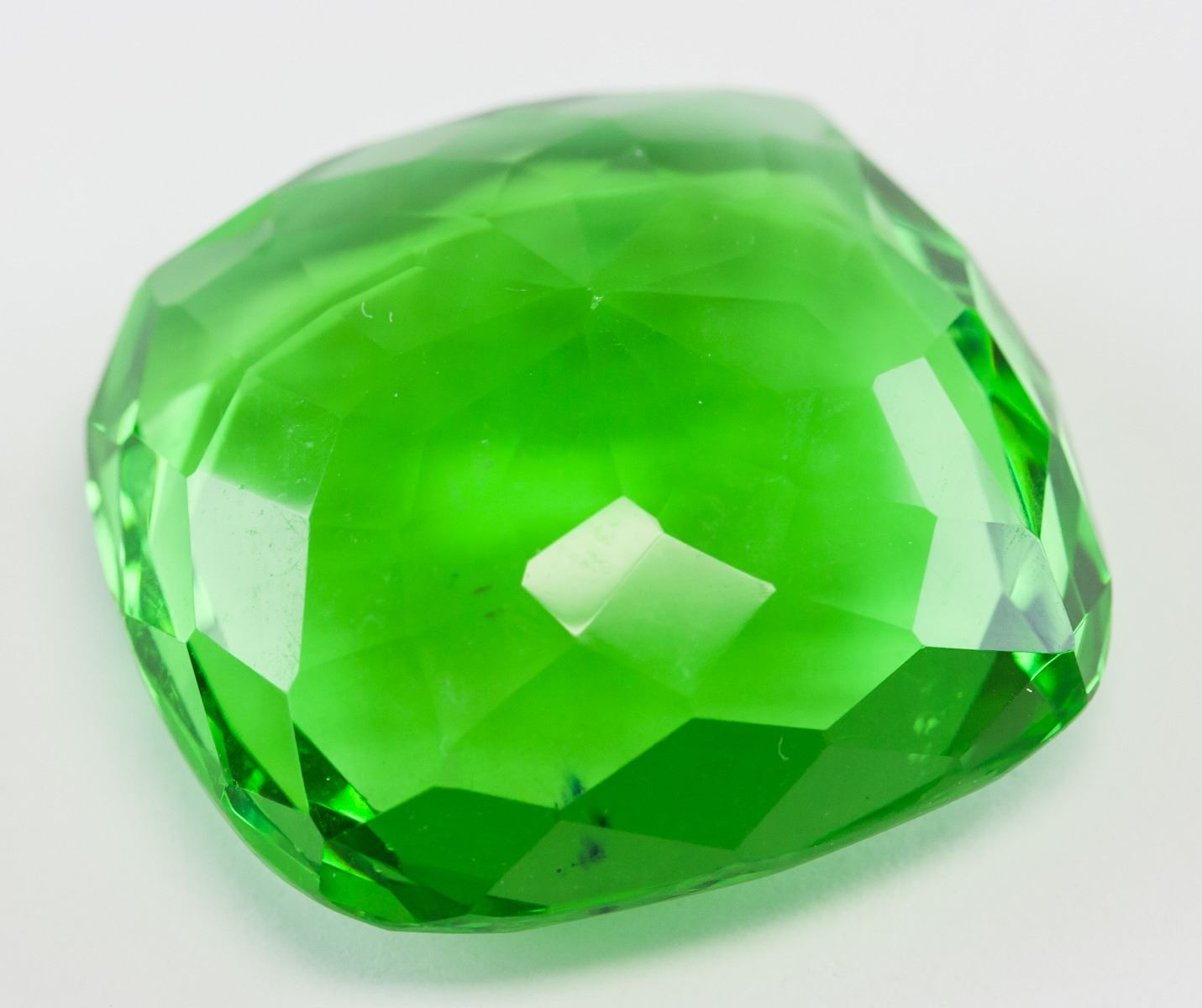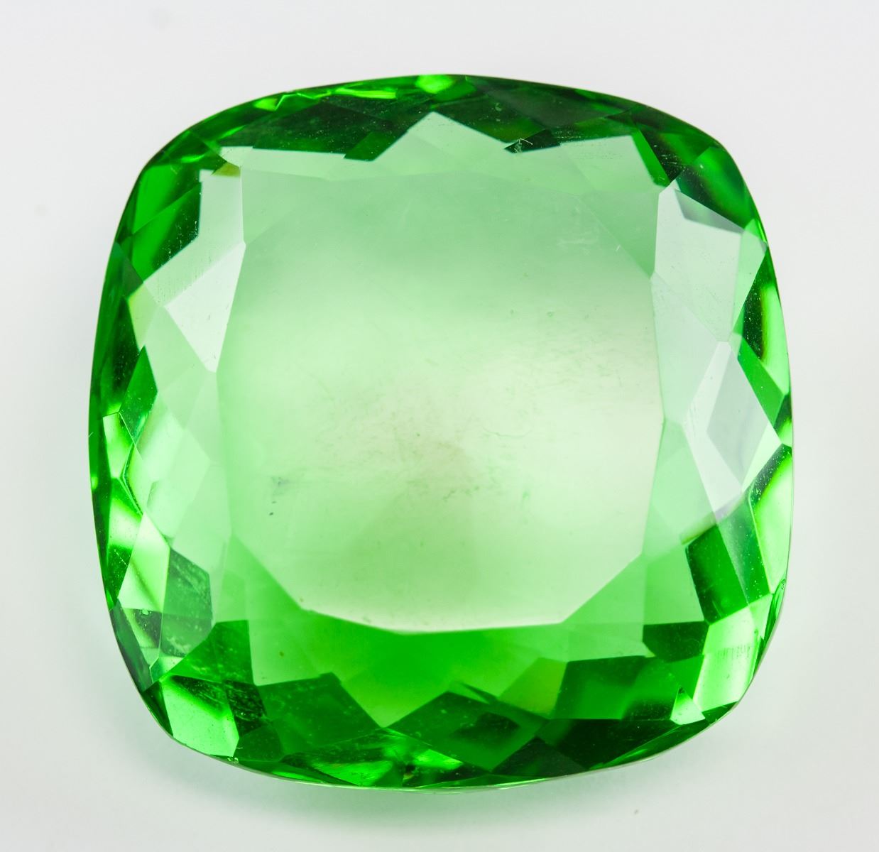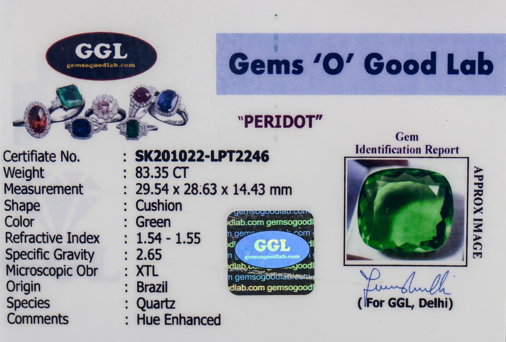 One (1) 83.35 ct cushion cut green peridot. Origin: Brazil. Accompanied with GGL certificate. 29.54 x 28.63 x 14.43 mm.