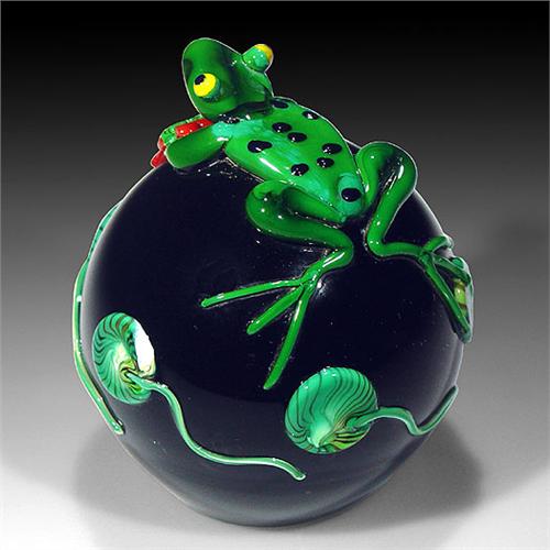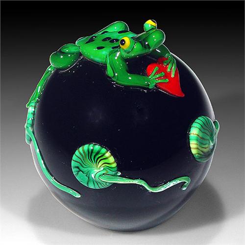 Correia Art Glass "Green Frog with Red Heart" paperweight. A three-dimensional, black-spotted, dark green frog, holding a red heart, rests on the top of the glossy black surface. A spaced ring of green lily pads encircles the sides of the piece. Signed. Diameter 2 3/8". NO RESERVE