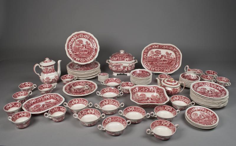 To include coffee pot, tea pot, creamer, covered tureen, platters, serving bowls, soup bowls, cups, saucers, dinner plates and more, some with slight repair, circa early 20th century.