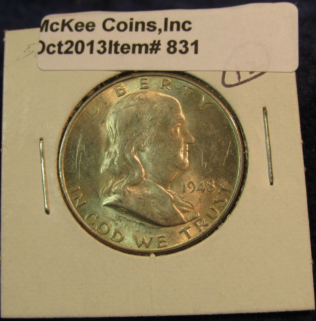 831. 1948 D Franklin Half Dollar. AU-Unc.