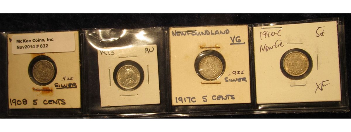 832. 1908 VG, 13 AU, 17C VG, & 40C EF Newfoundland Five Cent Silvers.