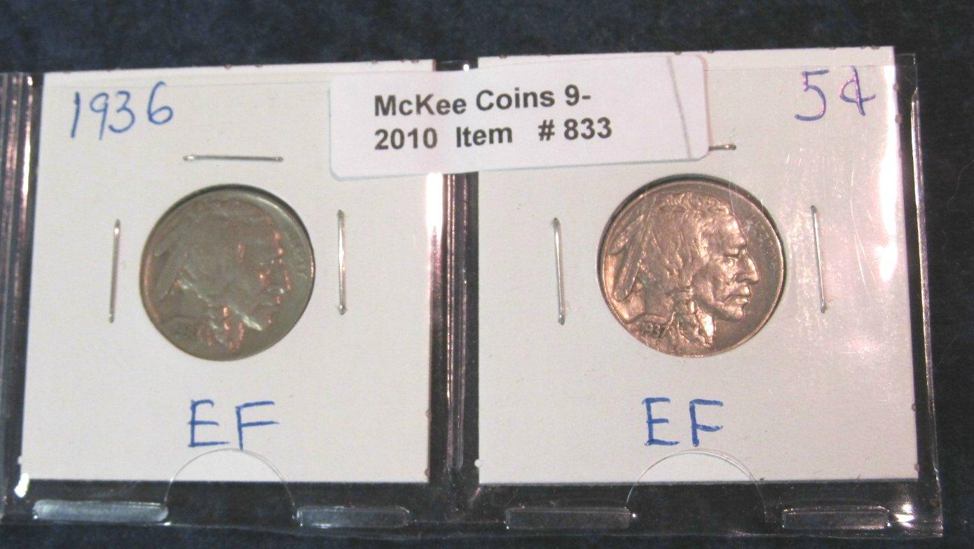 833. 1936P & 37P Buffalo Nickels. EF.