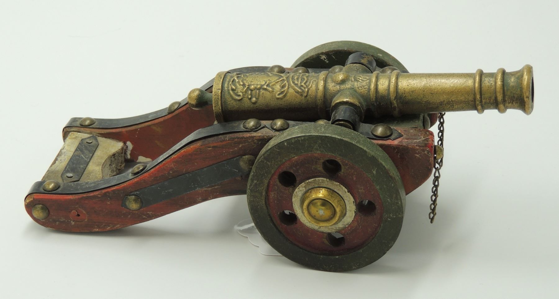FOR DISPLAY DEPICTING WESTERN EUROPEAN CANNON WITH MOVABLE WHEELS BRASS CANNON WOOD BASE MID 20TH CENTURY