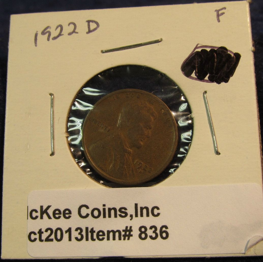 836. 1922 D Lincoln Cent. VG-8. Redbook value $21.00.