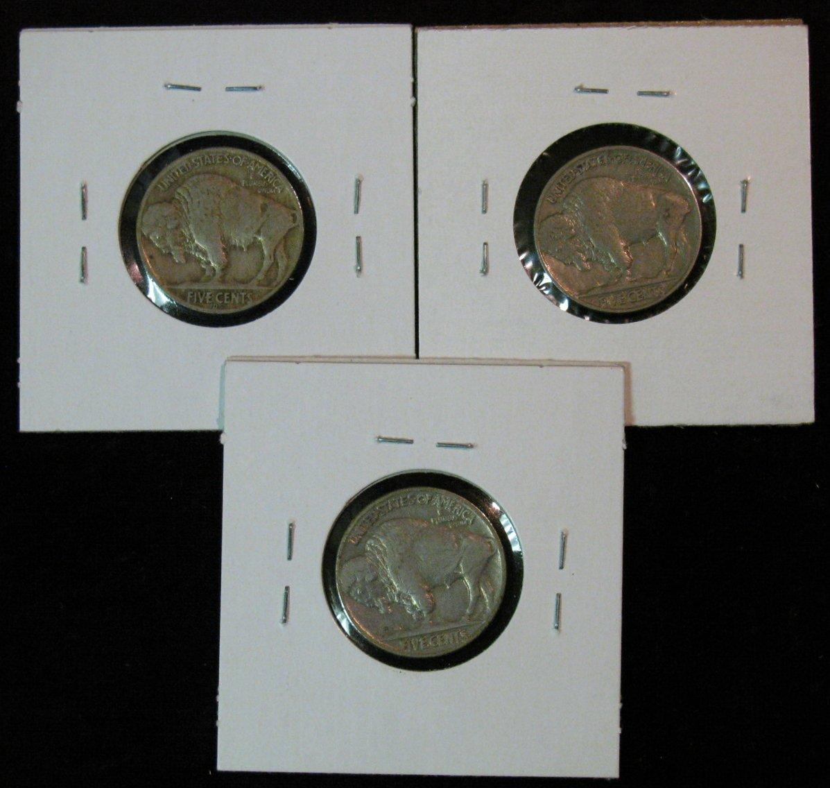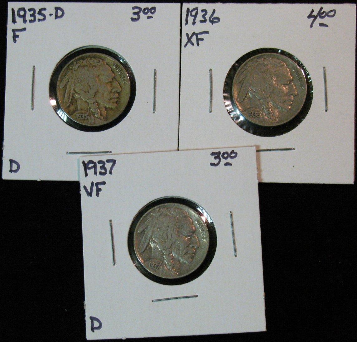 837. 1935D F, 36P EF & 37P VF Buffalo Nickels.