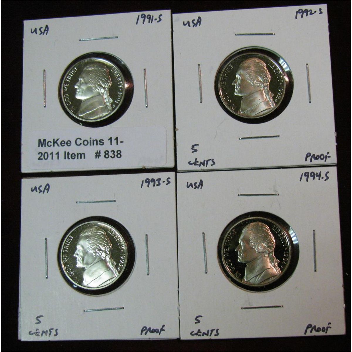 838. 1991S, 92S, 93S & 94S Jefferson Nickels. Proof.