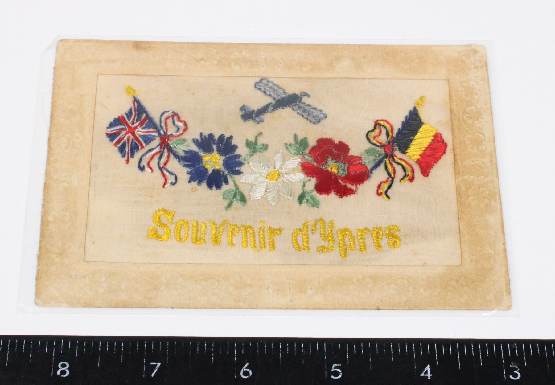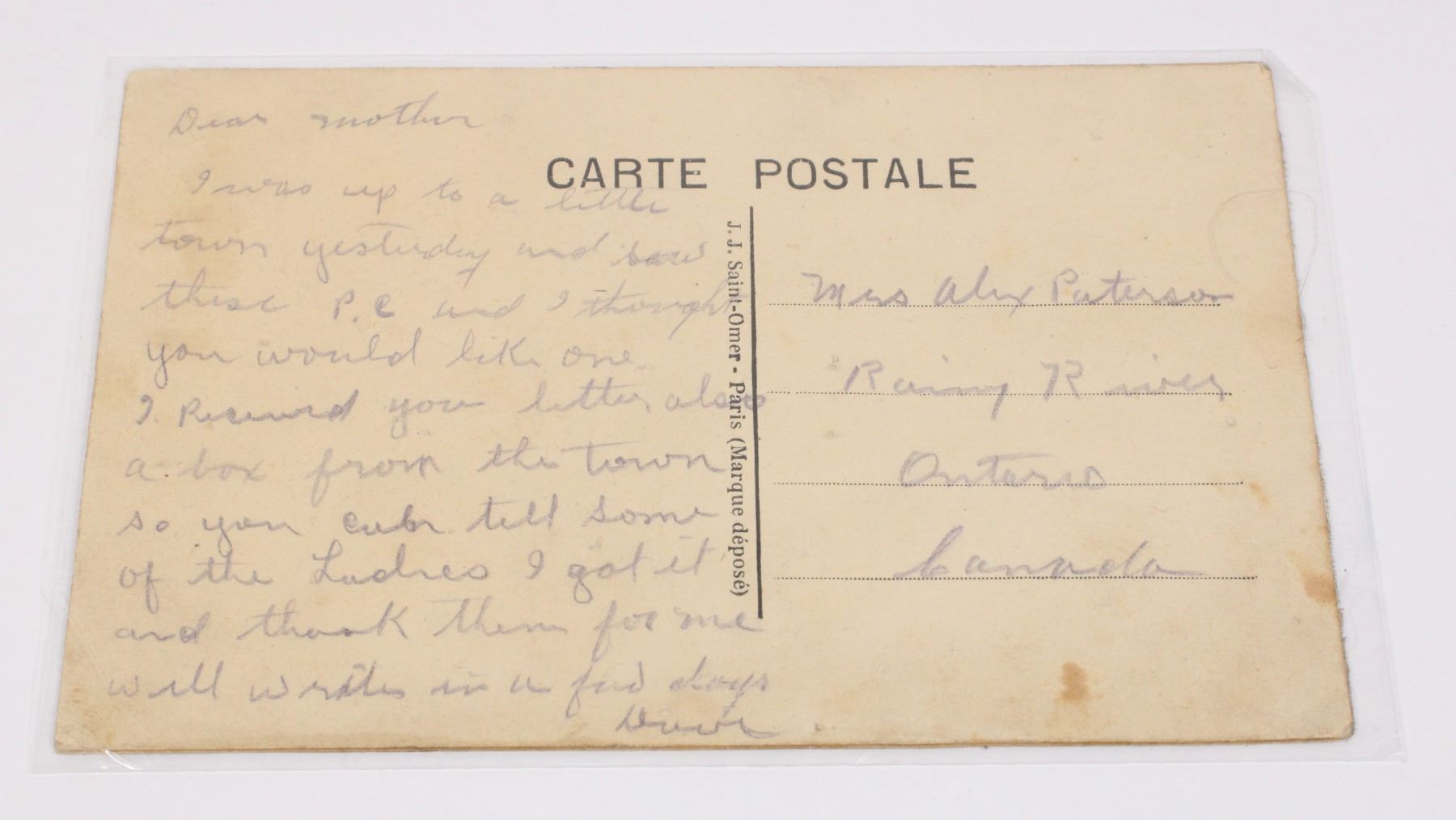 WRITTEN ON REVERSE BY CANADIAN SOLIDER TO MOTHER IN RAINY RIVER ONTARIO-WORLD WAR ONE SILK POSTCARD- SILK STITCHED DESIGN ON POSTCARD- MARKED PARIS. INCLUDES PLASTIC POSTCARD PROTECTIVE SLEEVE