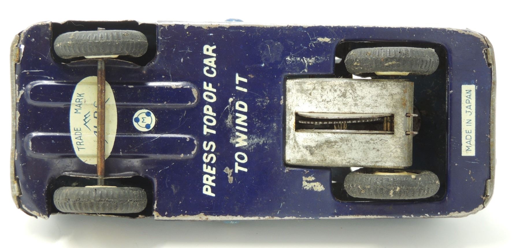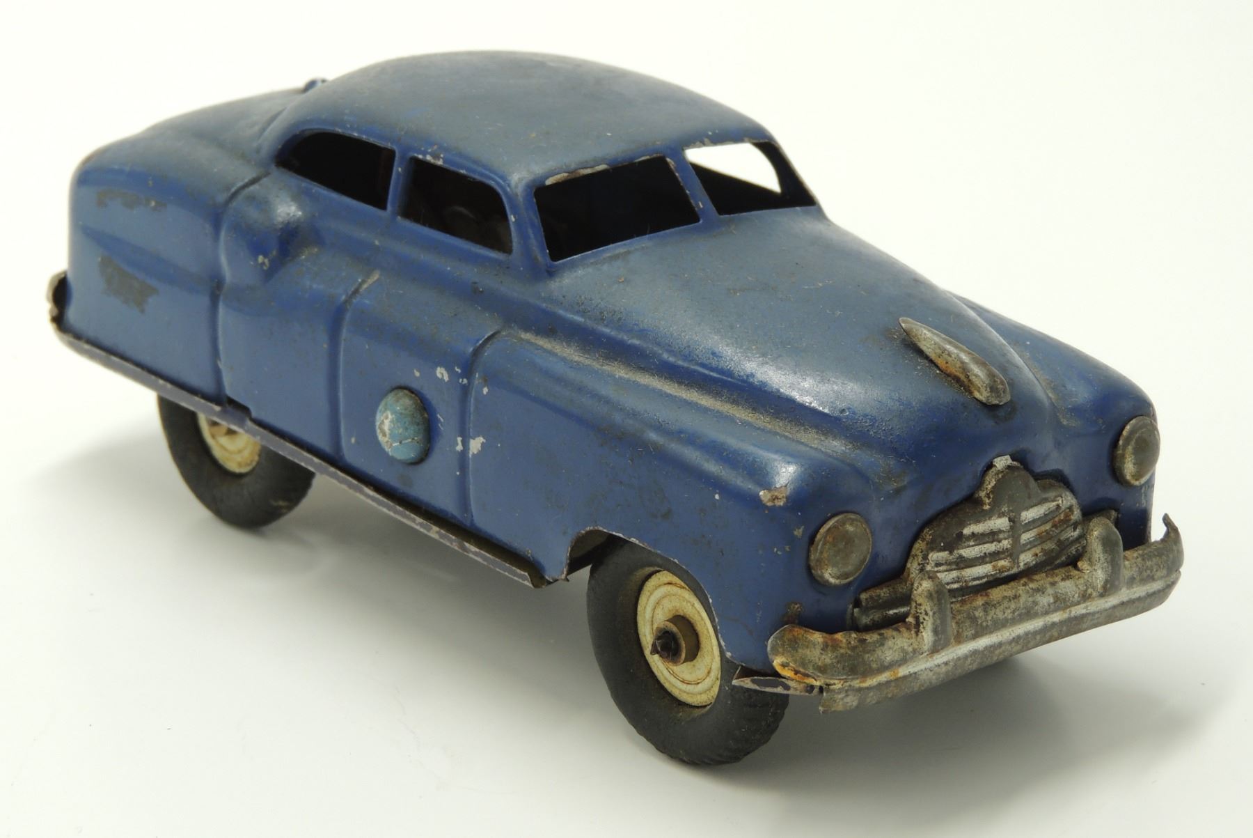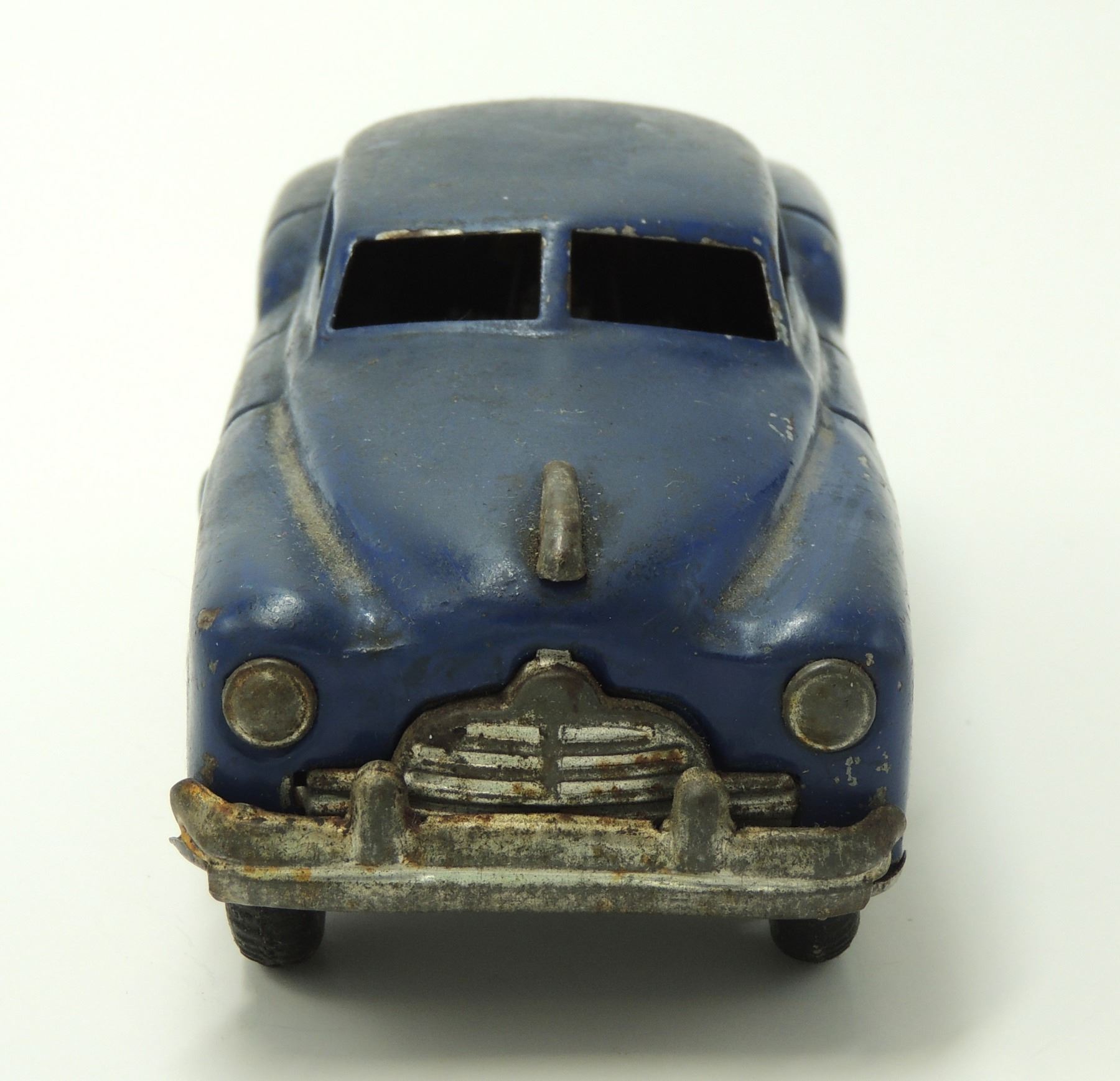 FOR RESTORATION REPAIR 1950'S METAL BLUE 4 DOOR CAR TOY MAKER MARKED ON LOWER CARD