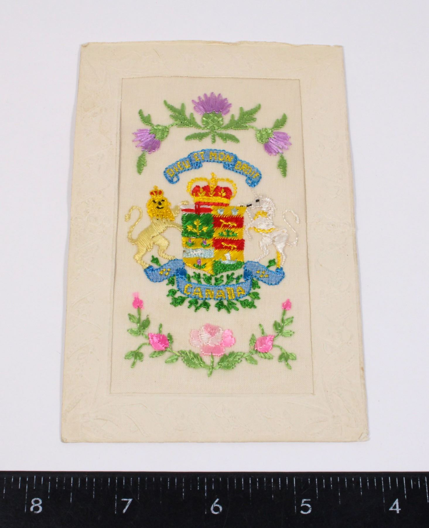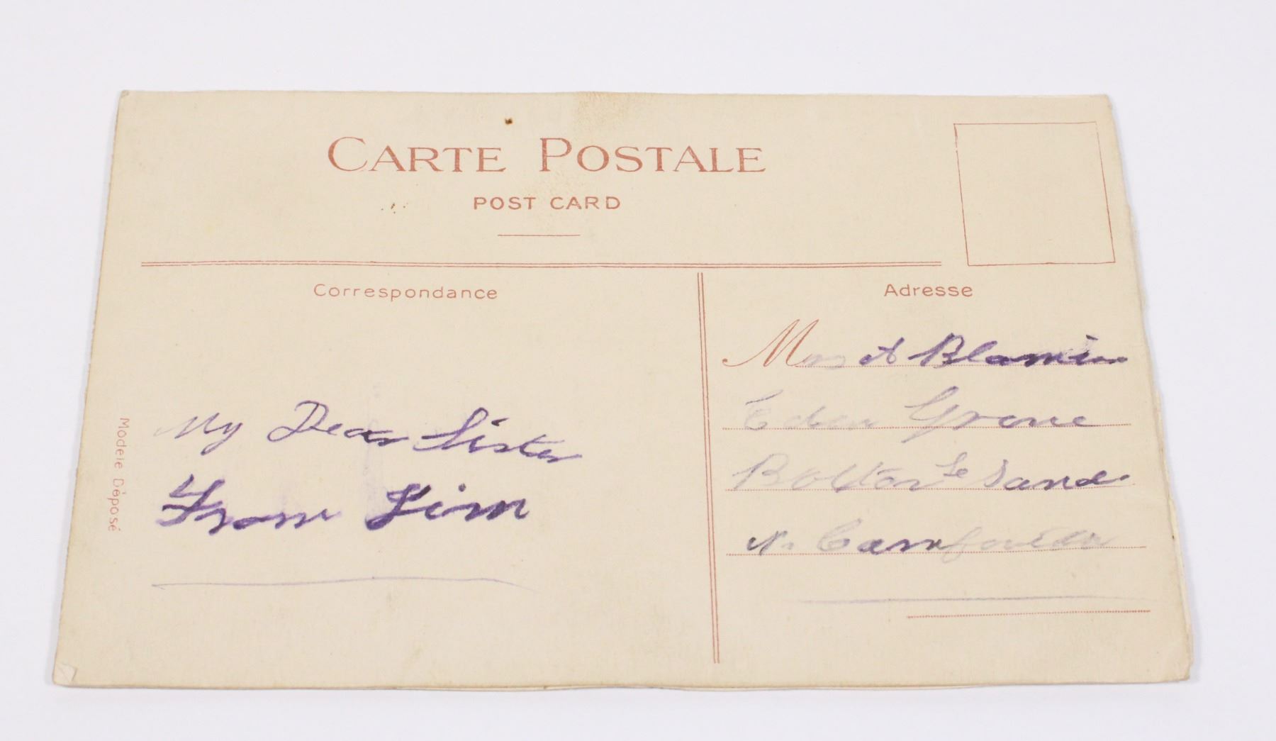 WRITTEN ON TO HIS SISTER- WORLD WAR ONE SILK POSTCARD- SILK STITCHED DESIGN ON POSTCARD- MARKED BY FRENCH CARD MANUFACTURER. INCLUDES PLASTIC POSTCARD PROTECTIVE SLEEVE