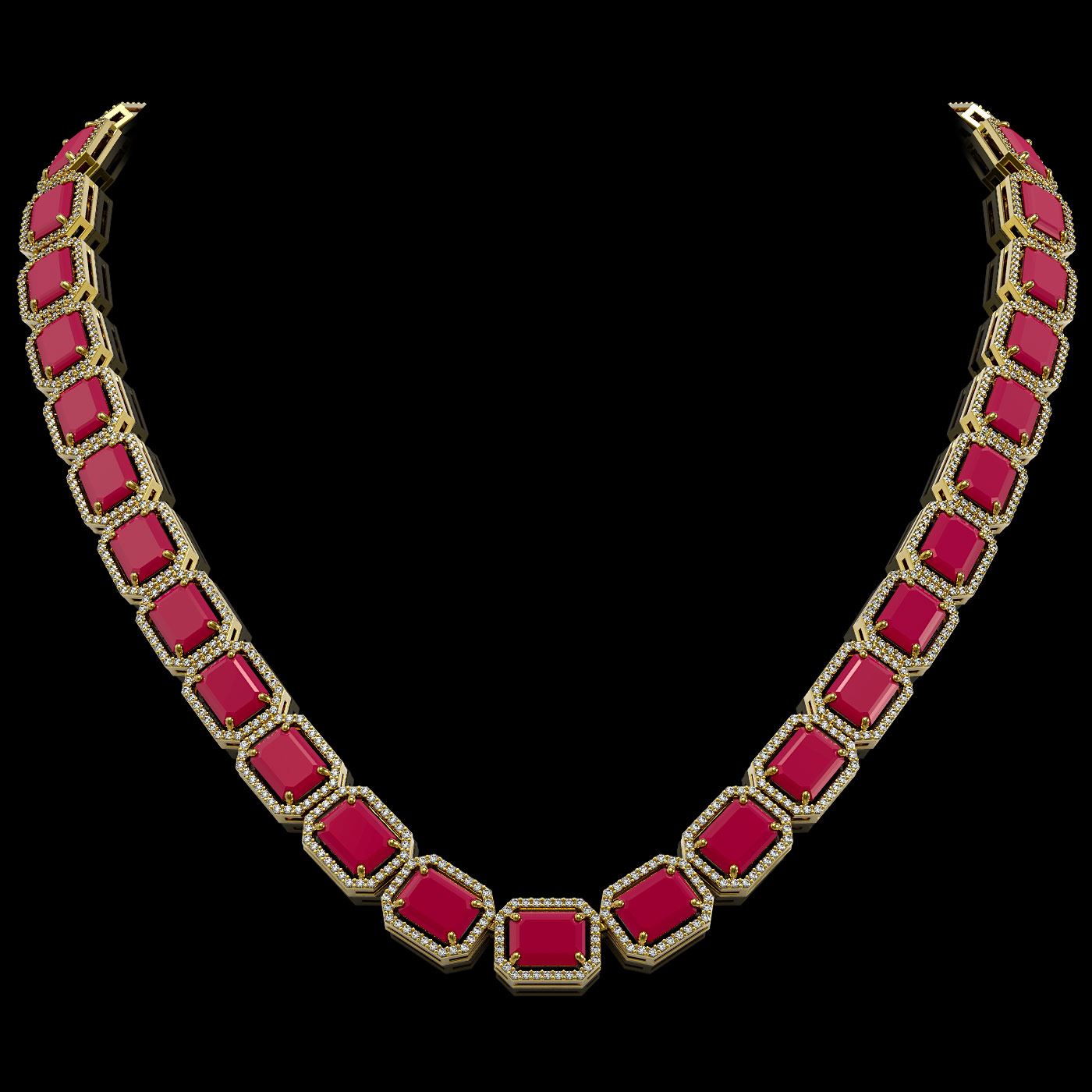 REF-930A2X -41479 ---- 84.94 CTW Ruby & Diamond Halo Necklace 10K Yellow Gold ---- Luxury Designer Brand Necklace Appraised at $51,150 Certificate Number US41479 10k Yellow gold, Necklace Size is 16 Inches, Necklace measuring approx. 10 mm x 16 Inches, weighing in total approx. 35 grams. Made in the USA and is stamped 10k, Main stone 77.55 carat total weight containing 33 pieces of Mid-Opaque-Deep Red color with AAA quality Emerald Cut shape cut Ruby , Stone #2 7.39 carat total weight containing 924 pieces of G-H color with VS/SI quality Round shape cut Diamond