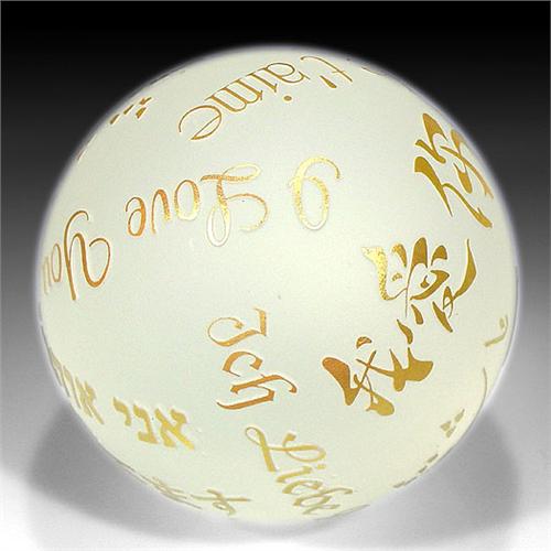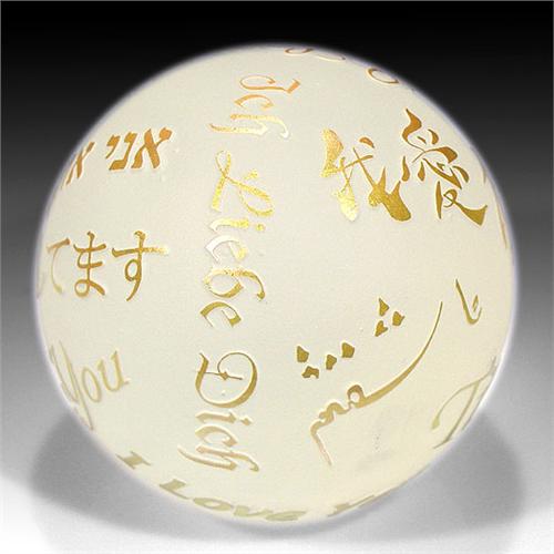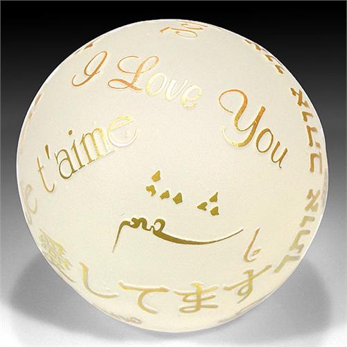 Correia Art Glass "I Love You" surface design frosted glass paperweight. The piece is composed of the phrase "I Love You" in English, and several other languages, in raised gold letters, on a frosted surface. Signed. Diameter 3 1/2". NO RESERVE