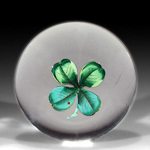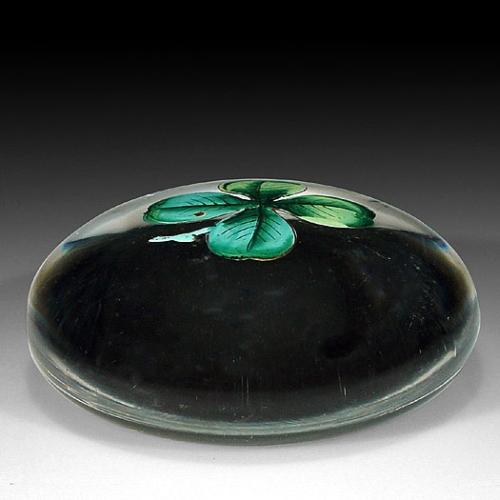 Miscellaneous low-domed, painted, four-leaf clover paperweight, with a four-leaf clover, in shades of dark to light green enamel, centered on the surface. Diameter 2 5/8". NO RESERVE