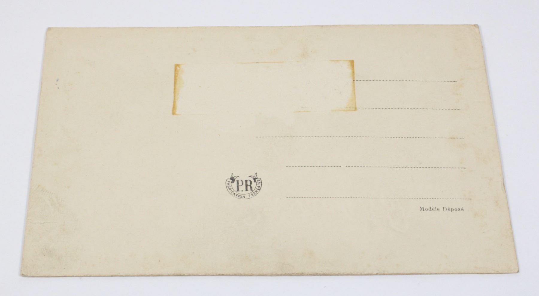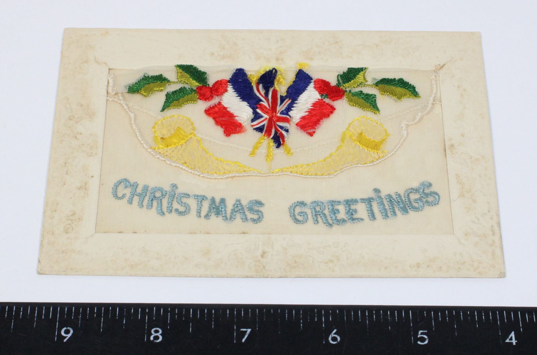 WORLD WAR ONE SILK POSTCARD-- OPENS IN CENTER TO STORE CARD- SILK STITCHED DESIGN ON POSTCARD- MARKED PARIS BY CARD MANUFACTURER. INCLUDES PLASTIC POSTCARD PROTECTIVE SLEEVE