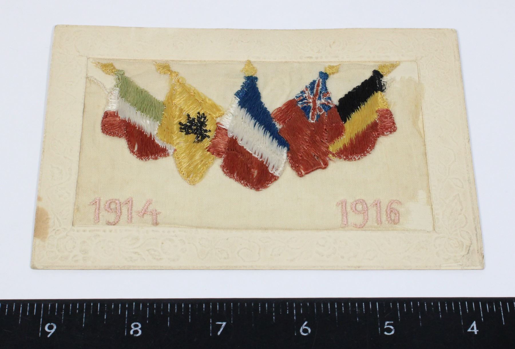 DEPICTS ITALY BELGIUM CANADA FRANCE RUSSIA FLAGS ON POLES WORLD WAR ONE SILK POSTCARD- SILK STITCHED DESIGN ON POSTCARD- MARKED PARIS BY CARD MANUFACTURER. INCLUDES PLASTIC POSTCARD PROTECTIVE SLEEVE