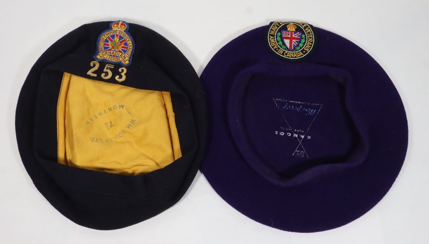 BRITISH EMPIRE SERVICE LEAUGE AND ARMY NAVY & AIR FORCE VETERANS IN CANADA BERETS BY KANGOL AND SCULLY LTD MONTREAL KINGS CROWN CLOTH BADGES WORLD WAR TWO CANADIAN VETERANS