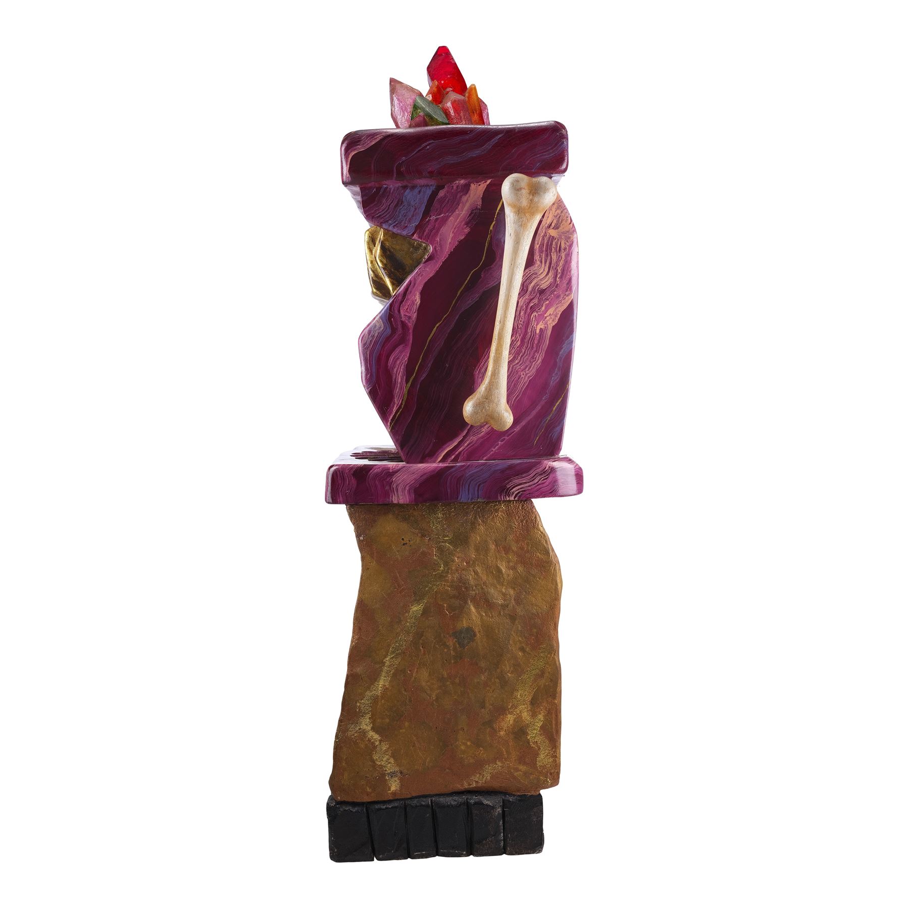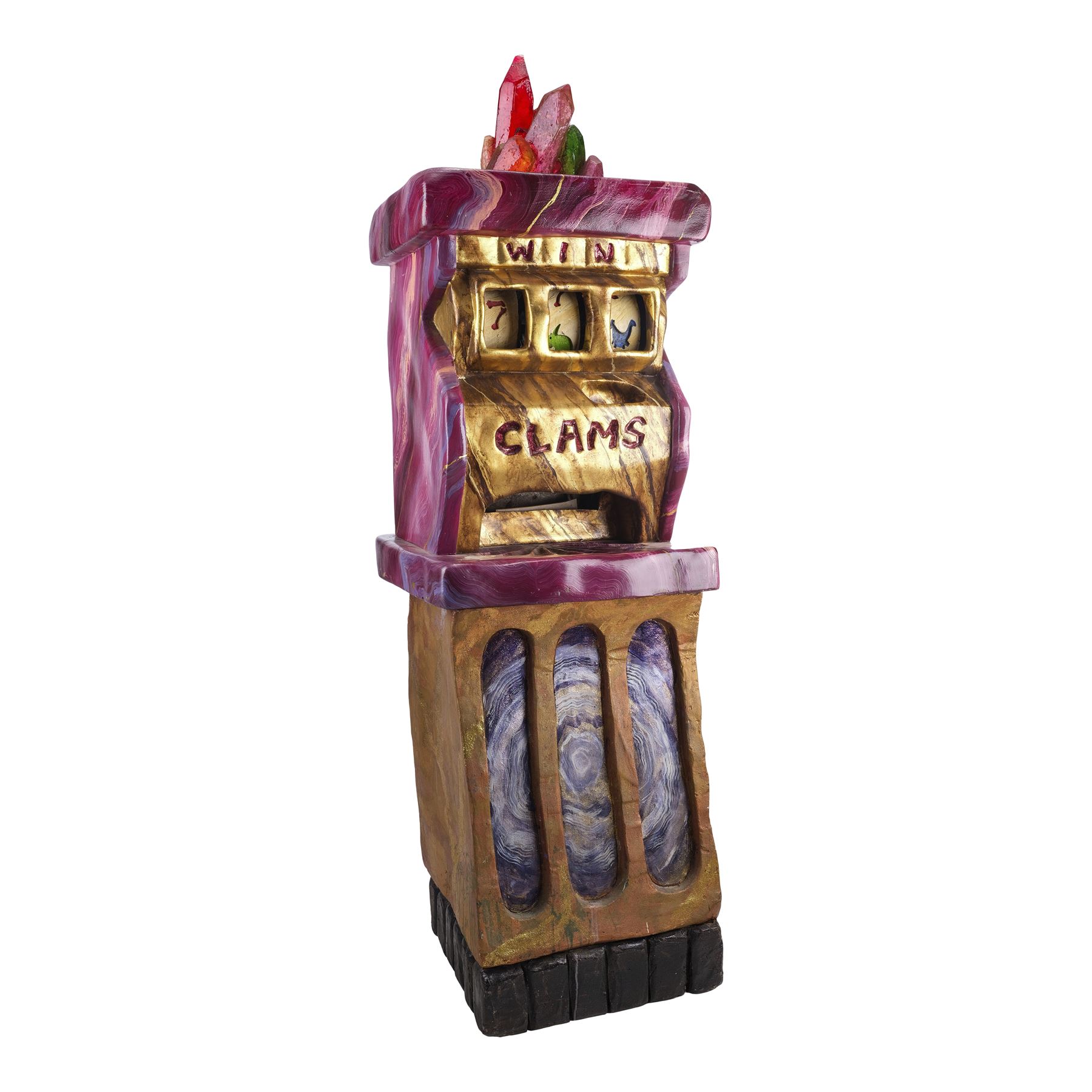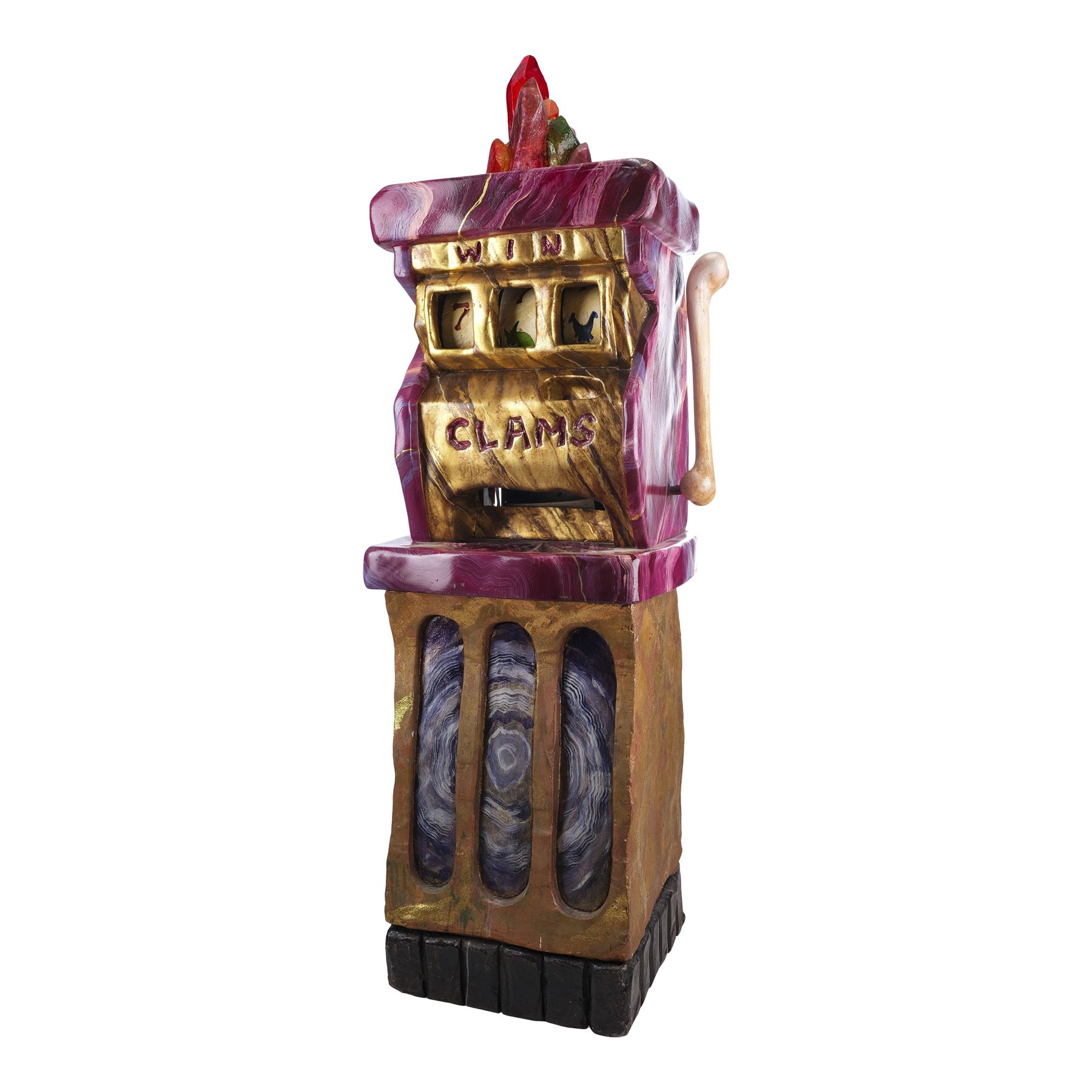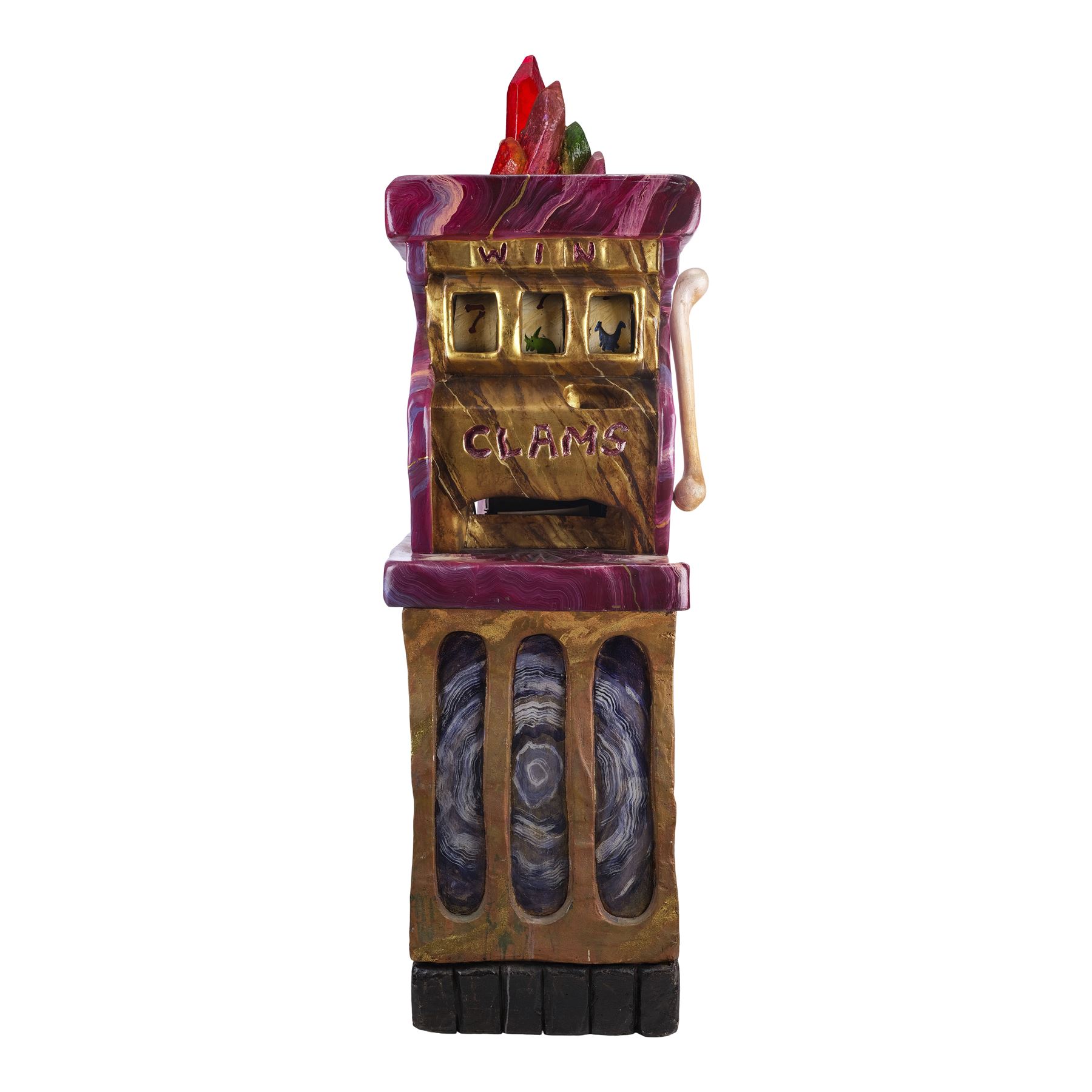 This slot machine is made of a hand-painted fiberglass exterior and a wooden and metal base over mechanical and electrical components marked "4" with hand-painted foam reels, a hand-painted bone-shaped lever, and color translucent fiberglass crystals at the top. This lot exhibits chipping paint exposing the fiberglass, grime, and is currently nonfunctional. Dimensions: 25" x 22" x 77" (63.5 cm x 56 cm x 195.75 cm)