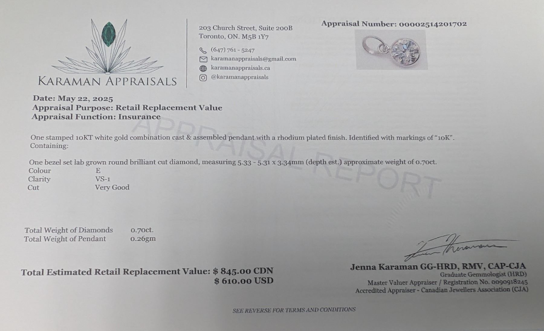 $845, 10K(0.26g), LAB DIAMOND (0.7ct) PENDANT, appraised/retail value $845
