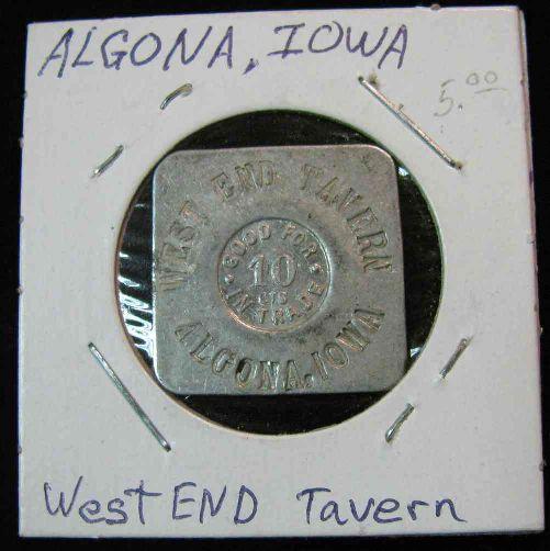 845. West End Tavern, Algona, Iowa, Good For 10 cts in Trade. Square Aluminum.