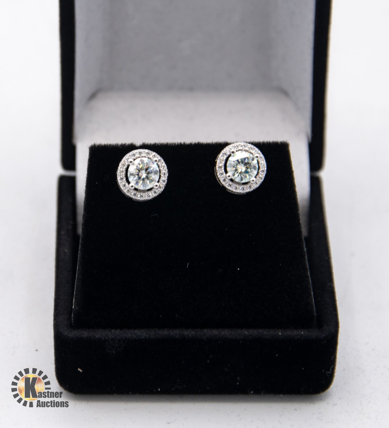 WITH 18 ROUND CUT CUBIC ZIRCONIA SET IN A HALO AROUND THE CENTER WEIGHING A TOTAL 0.06 CT PER EARRING SET IN STERLING SILVER