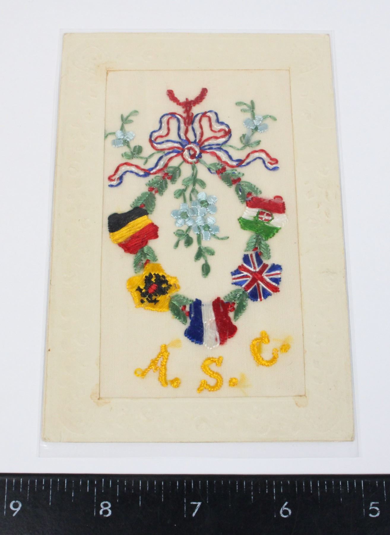 BRITISH ARMY SERVICE CORPS DESIGN WORLD WAR ONE SILK POSTCARD- SILK STITCHED DESIGN ON POSTCARD- MARKED PARIS BY CARD MANUFACTURER. INCLUDES PLASTIC POSTCARD PROTECTIVE SLEEVE