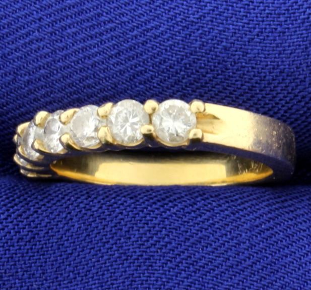14 K yellow gold. 7 diamonds- SI-2 to I-1 clarity, H color, Very good cut! .85ct TW. Size 6.5 4.7g