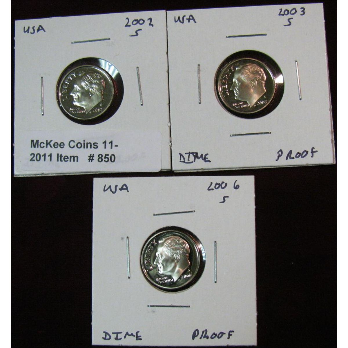 850. 2002S, 03S & 06S Roosevelt Dimes. Proof